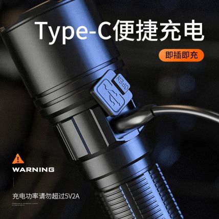 伸缩调焦,5档调节强光远射,快充接口充电