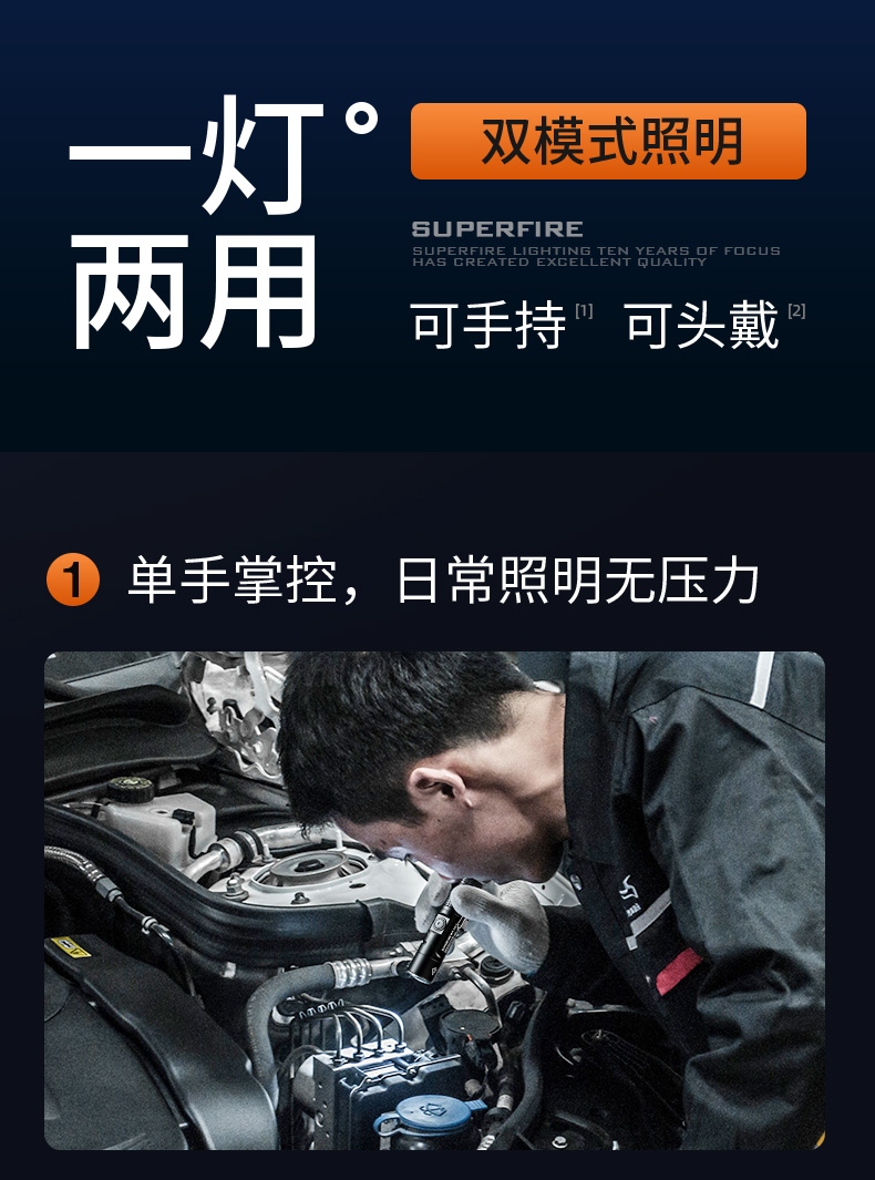 聚光主灯 亮度随心 轻按后端开关按钮,主灯强光点亮,续按依次切换主灯工作光-爆闪光。主灯开启状态下长按5秒,可实现光源色温转换。主灯关闭状态下长按5秒,可开启灯具最亮照明模式。 爆亮强光 亮如白昼 1500LM大功率高亮光源,点亮顷刻如白昼