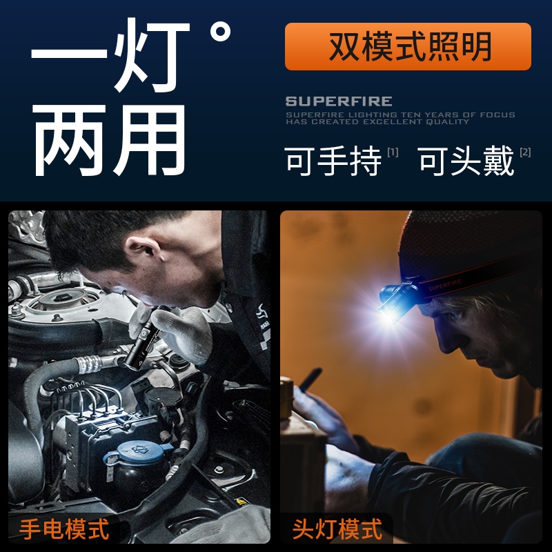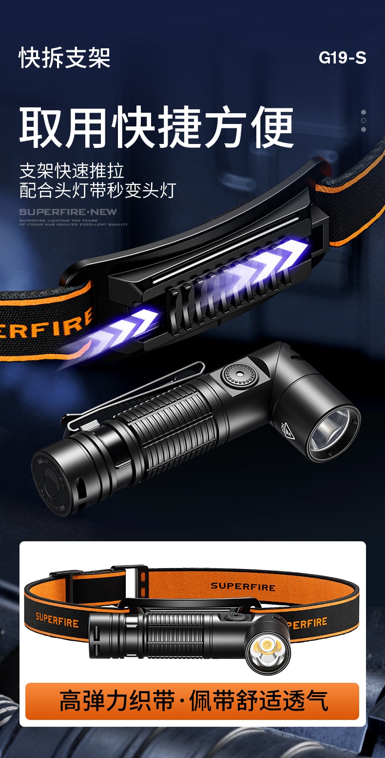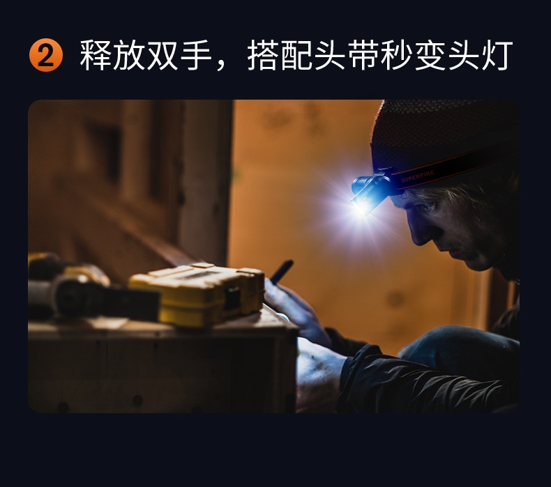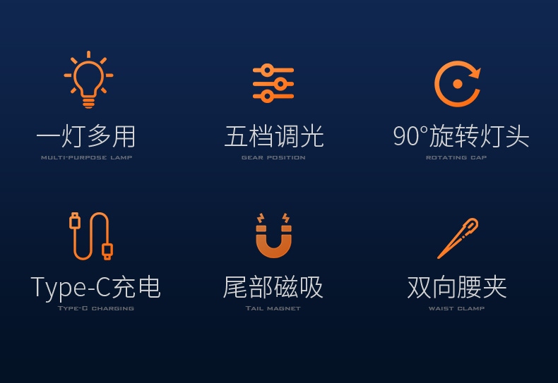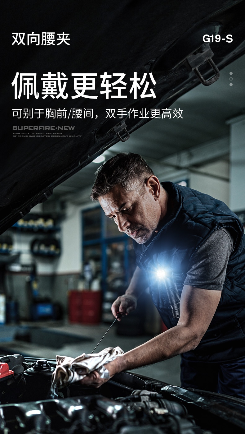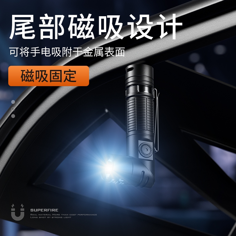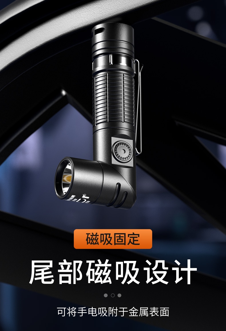 1、配头灯带及支架,可作为头灯使用。 2、尾部磁吸,可自由吸附铁质物品,释放双手,更自由。 3、双向腰夹,正反两方向携带。