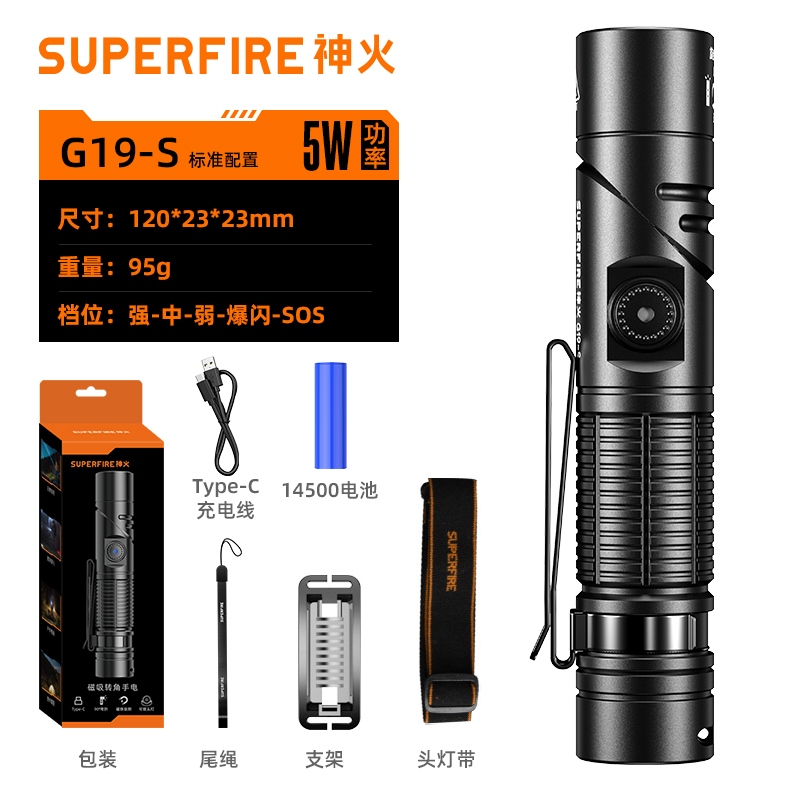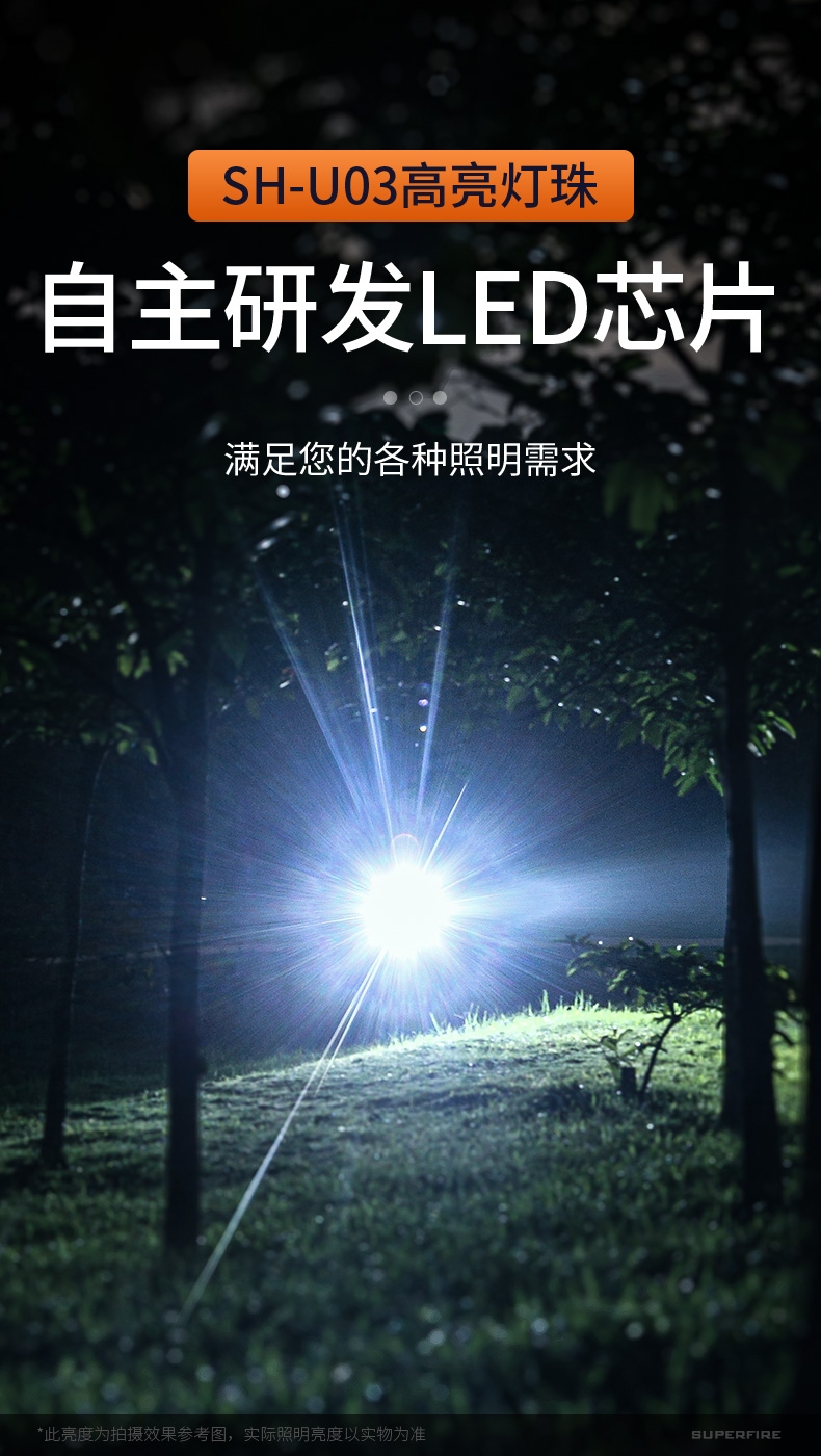 1、千米远射,射程更远,光斑更聚焦。 2、进口灯珠,亮度高,照明效果更好。 3、前后双按键,光源一键点亮,高亮瞬间开启。