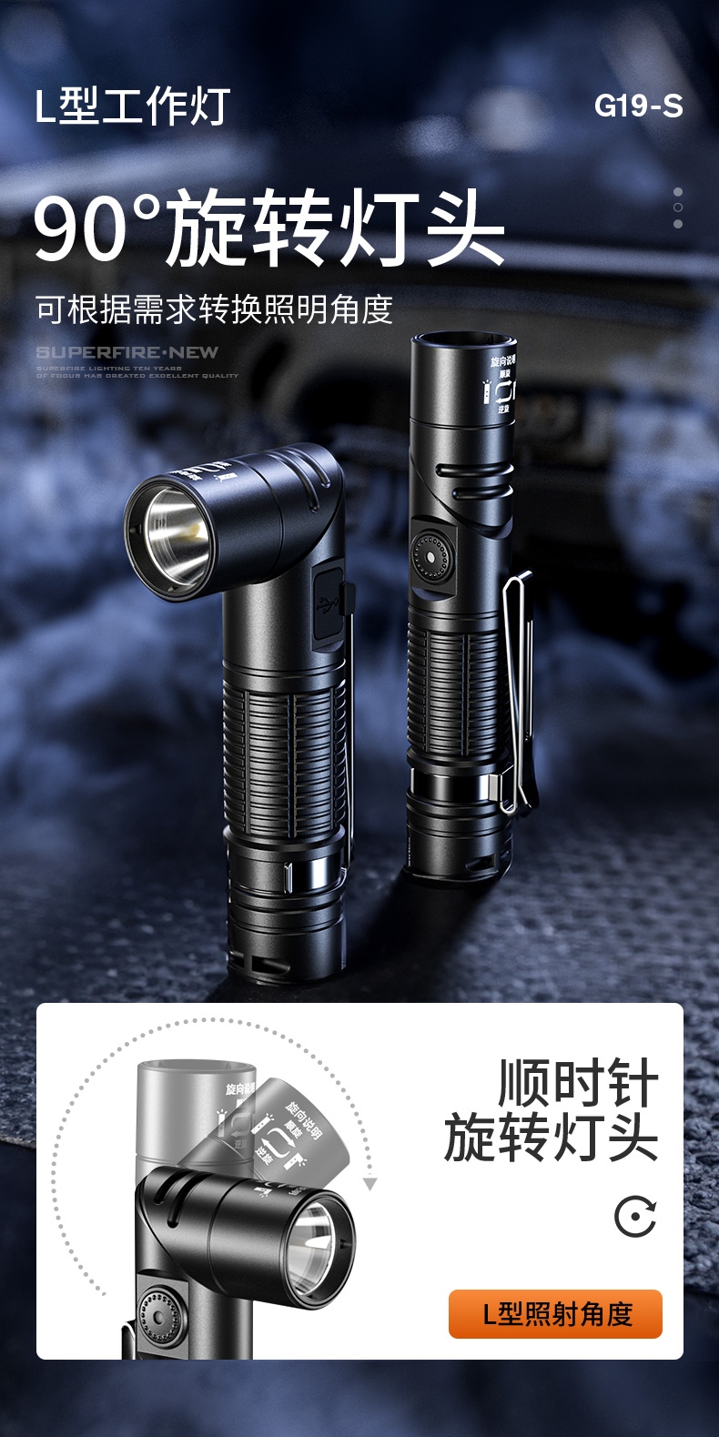 4、可90°旋转灯头,可作工作灯,