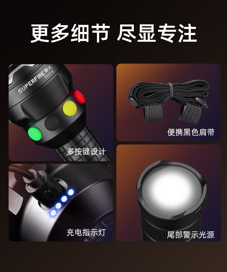 1、千米远射,射程更远,光斑更聚焦。 2、进口灯珠,亮度高,照明效果更好。 3、前后双按键,光源一键点亮,高亮瞬间开启。