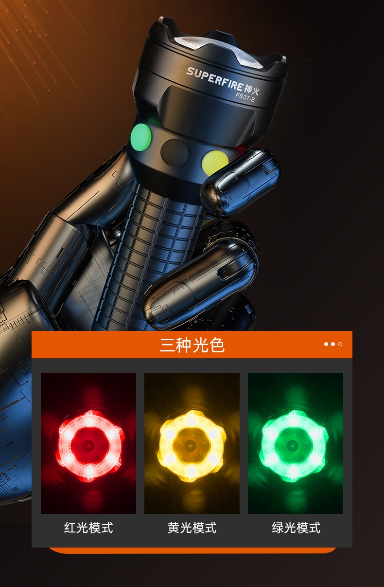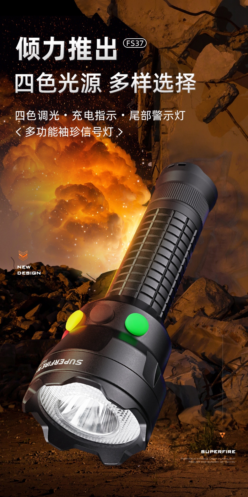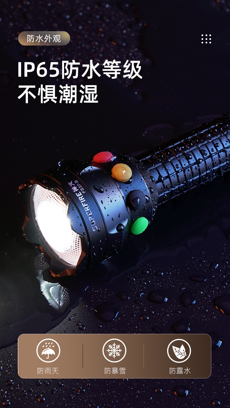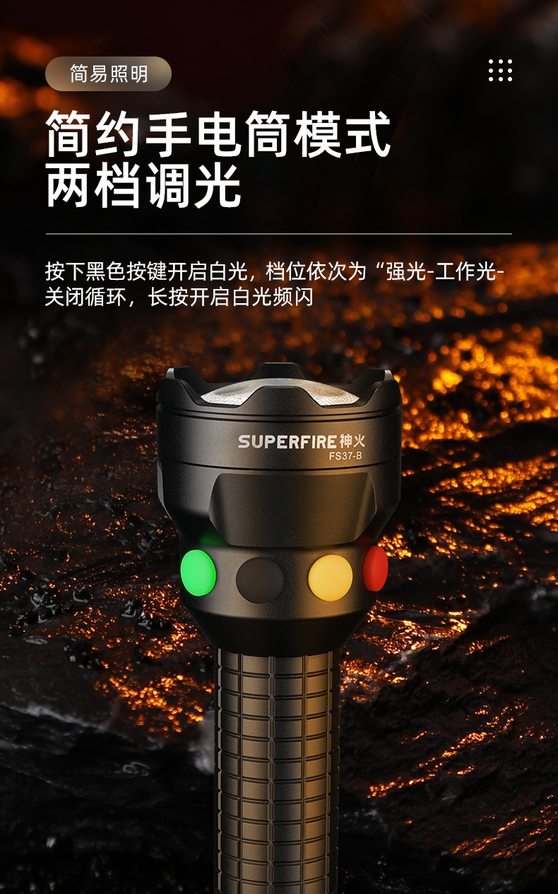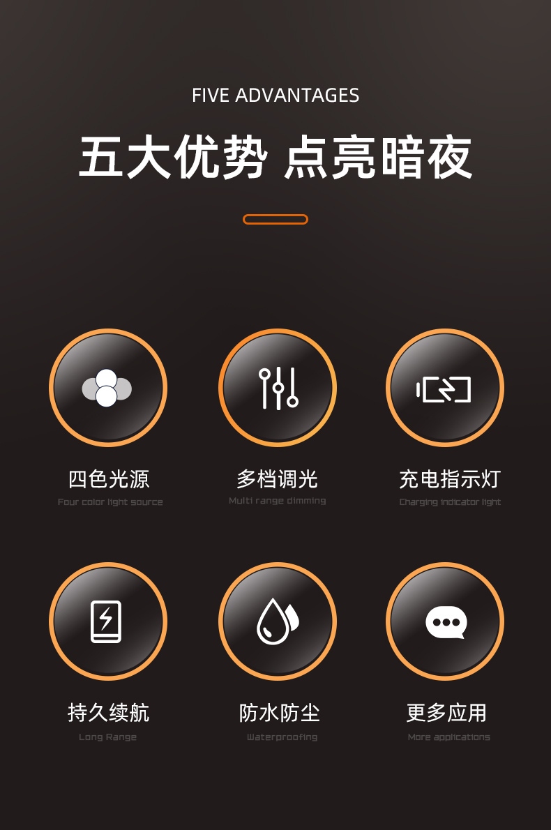 五大优势点亮黑夜 四色光源 多档调光 充电指示灯 持久续航 防水防尘 更多应用