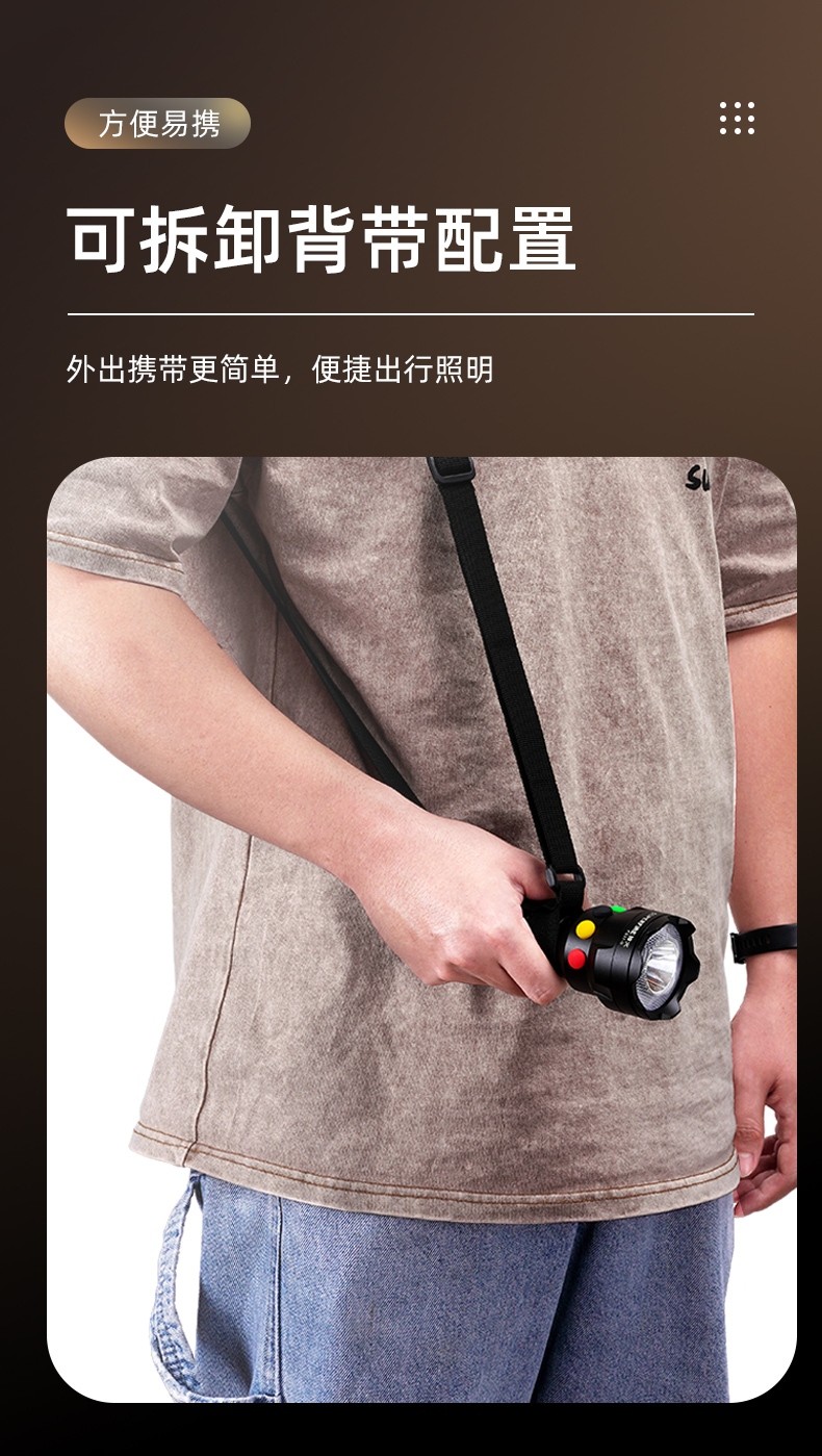 1、多档调光,可满足不同使用场景下的照明需求; 2、含提手,握感更舒适。携带更简单; 3、新型高亮远射灯珠,60W大功率,亮度高,照明效果好。
