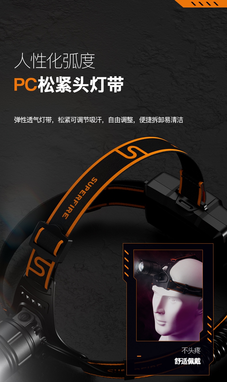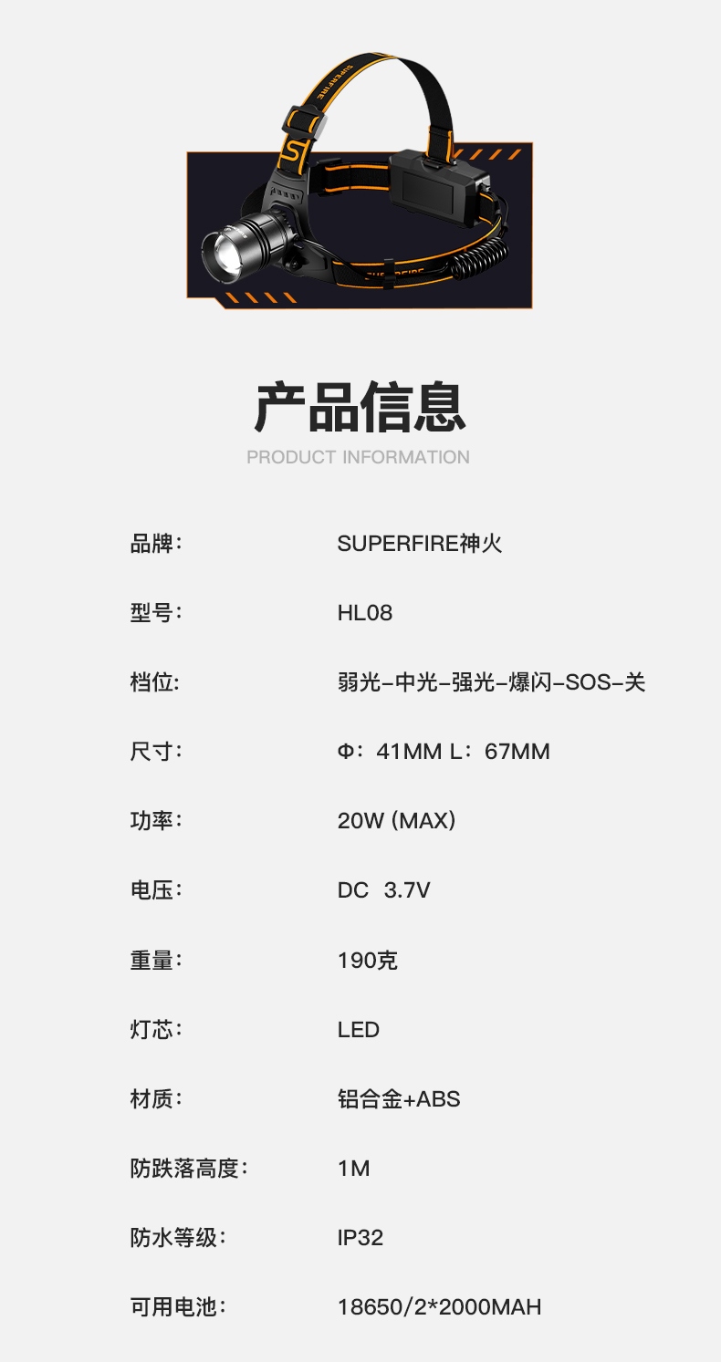 强光亮度,运动头灯,前后均衡设计,轻便不压头,可调节式头灯带,佩戴方便舒适,伸缩调焦,光照范围大,照射距离远,头灯角度调节,超90度角度随意调节,适宜各种环境使用