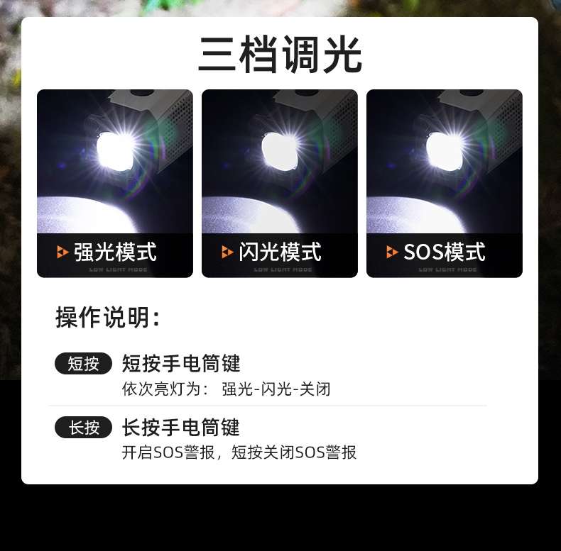 聚光主灯 亮度随心 轻按后端开关按钮,主灯强光点亮,续按依次切换主灯工作光-爆闪光。主灯开启状态下长按5秒,可实现光源色温转换。主灯关闭状态下长按5秒,可开启灯具最亮照明模式。 爆亮强光 亮如白昼 1500LM大功率高亮光源,点亮顷刻如白昼