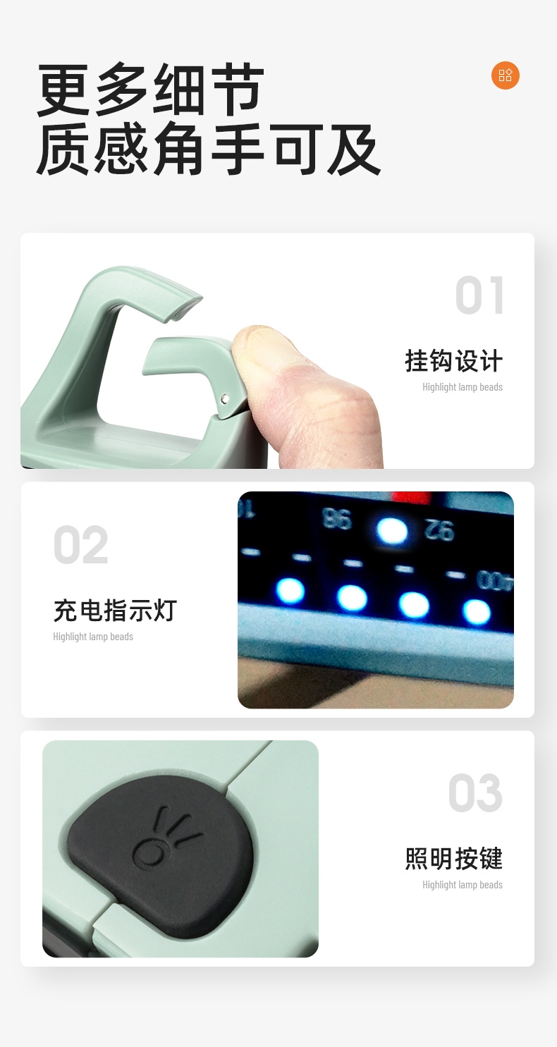 1、多档调光,可满足不同使用场景下的照明需求; 2、含提手,握感更舒适。携带更简单; 3、新型高亮远射灯珠,60W大功率,亮度高,照明效果好。