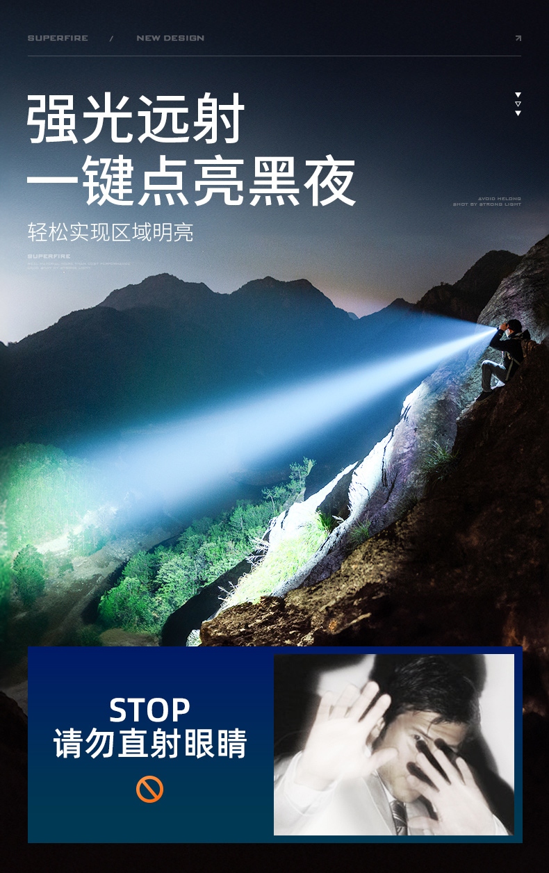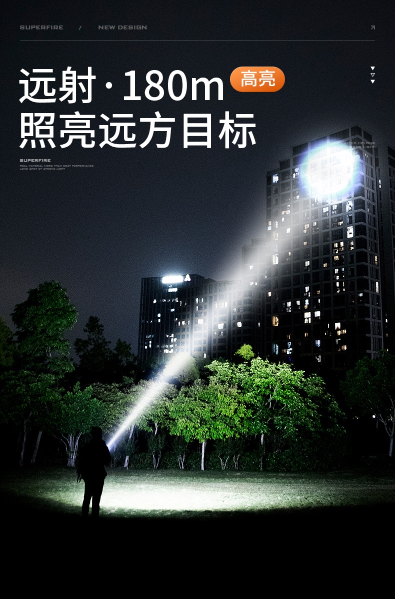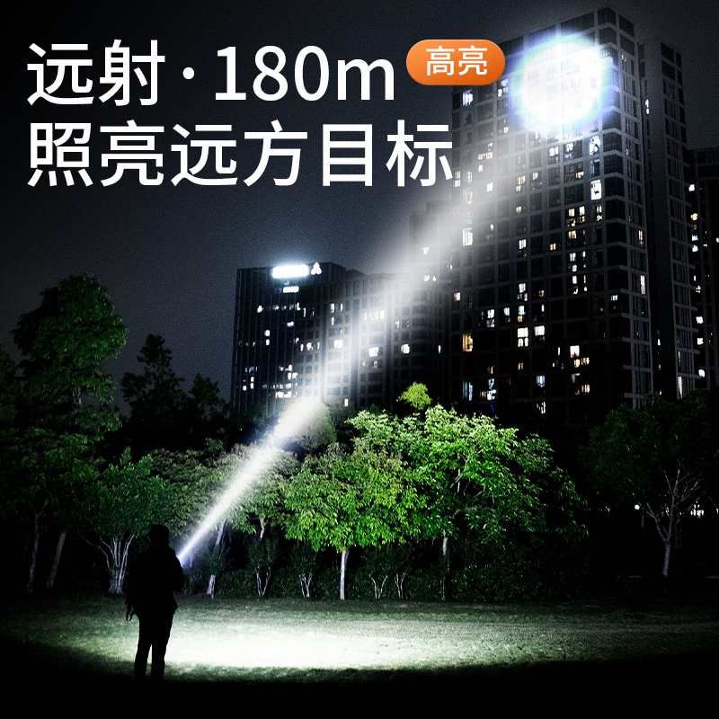 1、千米远射,射程更远,光斑更聚焦。 2、进口灯珠,亮度高,照明效果更好。 3、前后双按键,光源一键点亮,高亮瞬间开启。