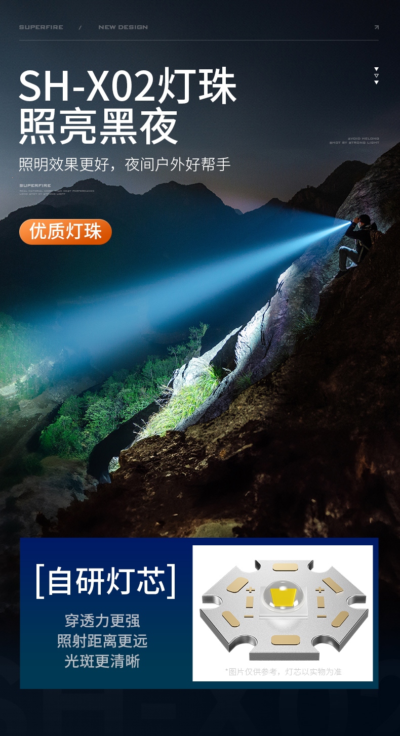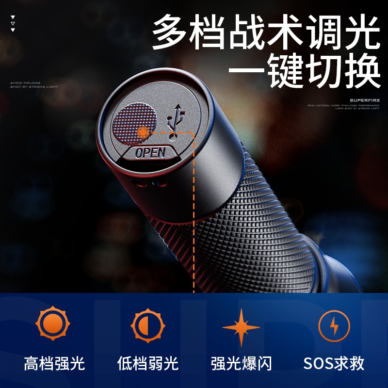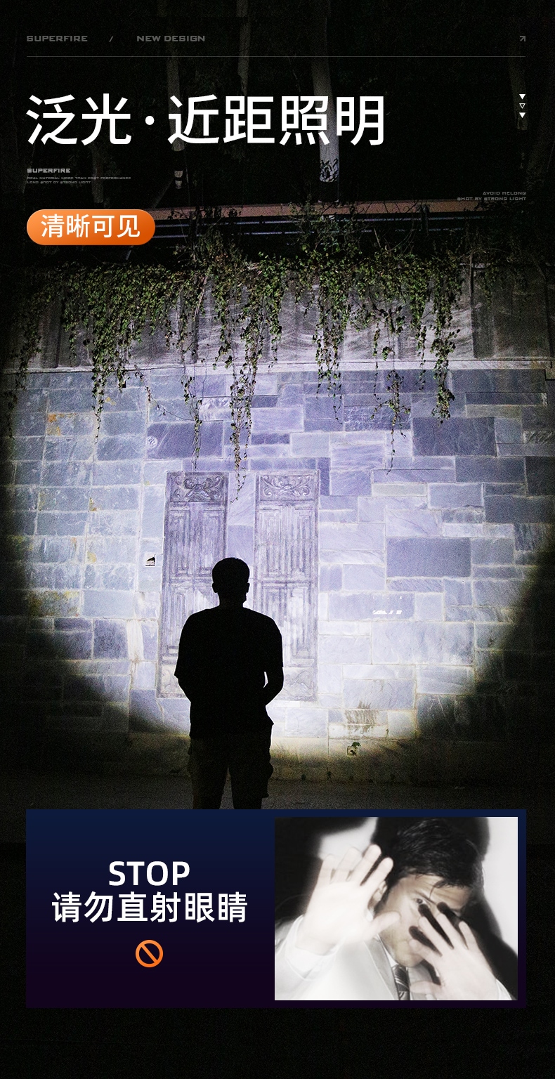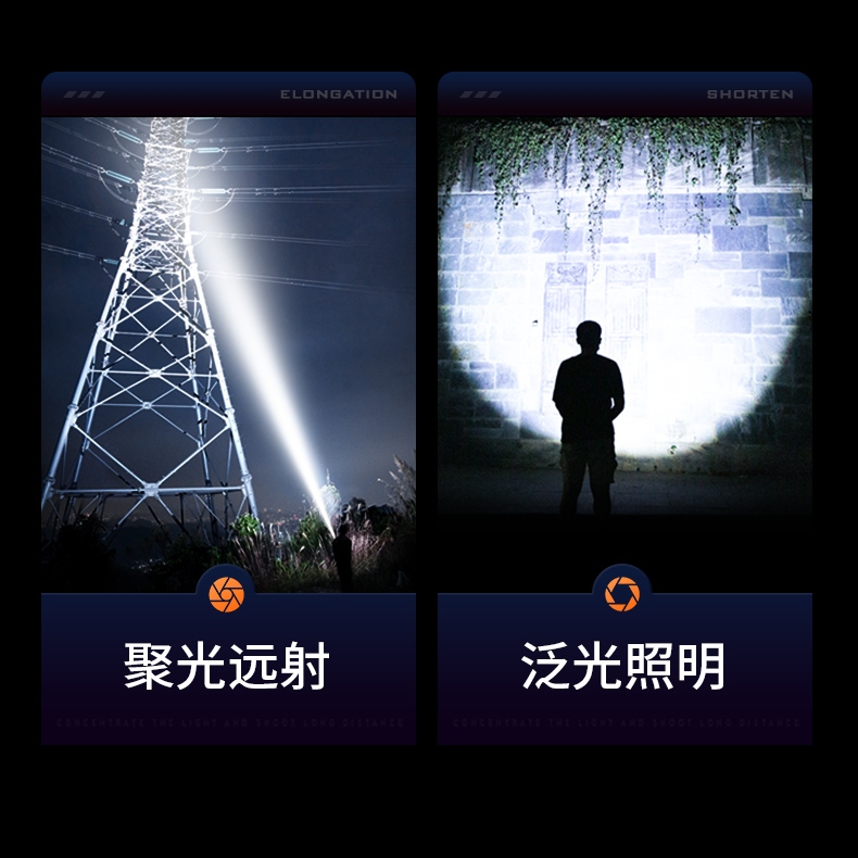 1、千米远射,射程更远,光斑更聚焦。 2、进口灯珠,亮度高,照明效果更好。 3、前后双按键,光源一键点亮,高亮瞬间开启。