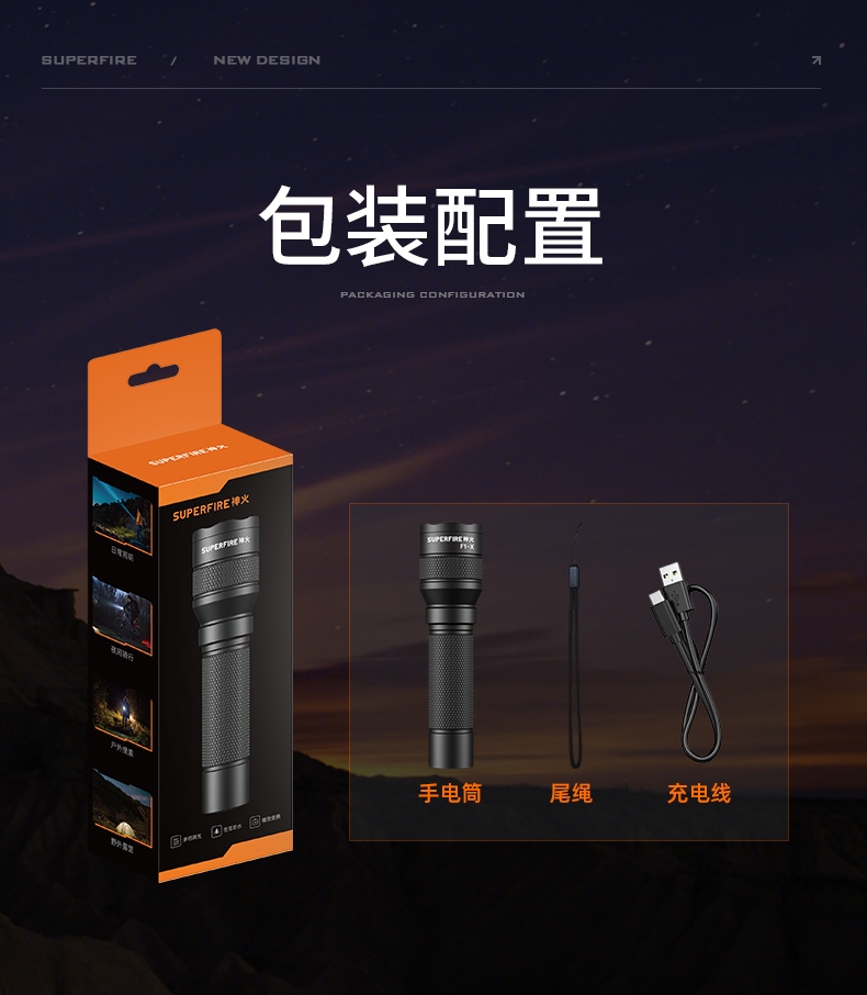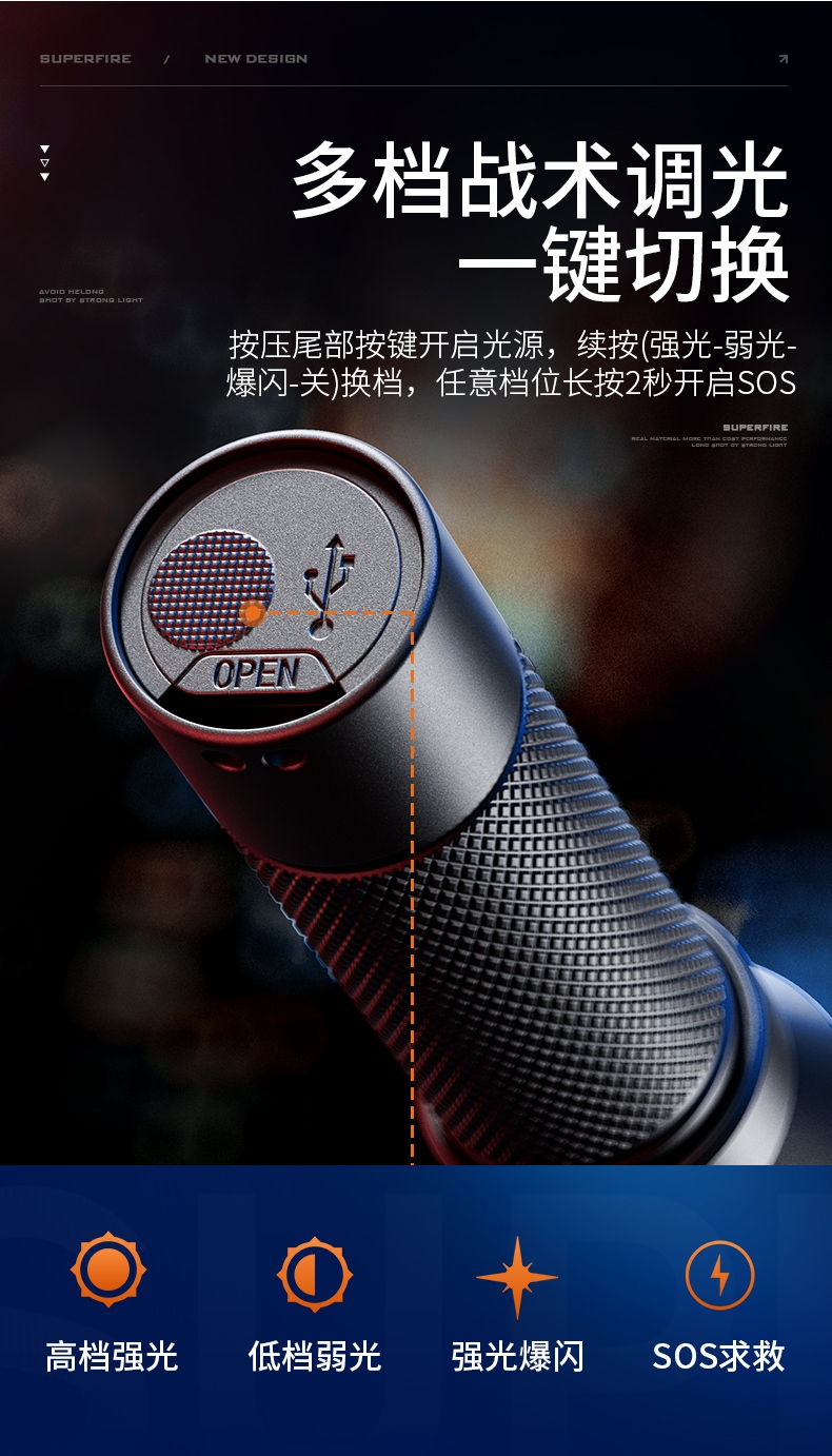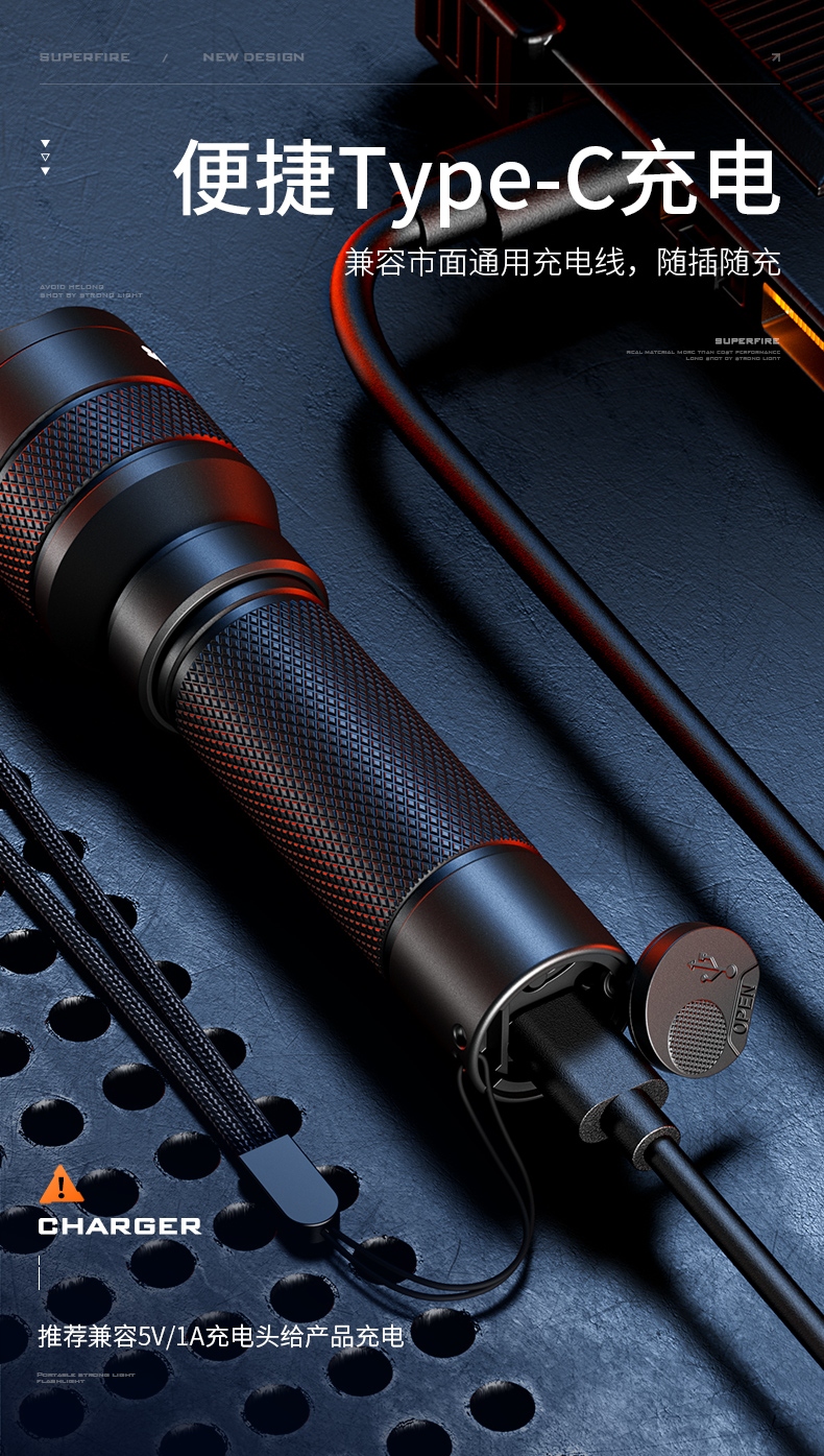 四档调光 Type-C充电 电量显示 铝合金筒身 持久续航 强力防水