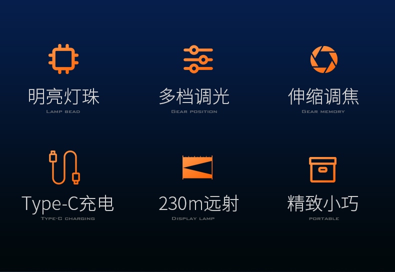 强光亮度,运动头灯,前后均衡设计,轻便不压头,可调节式头灯带,佩戴方便舒适,伸缩调焦,光照范围大,照射距离远,头灯角度调节,超90度角度随意调节,适宜各种环境使用