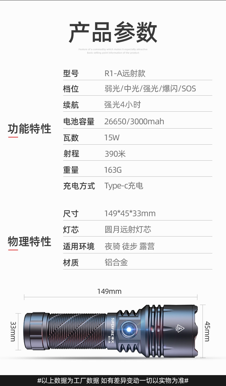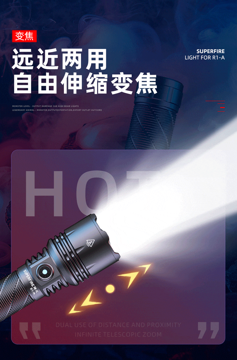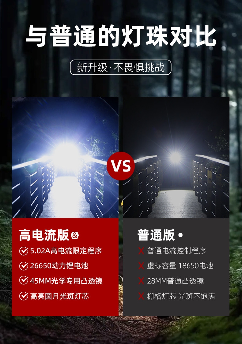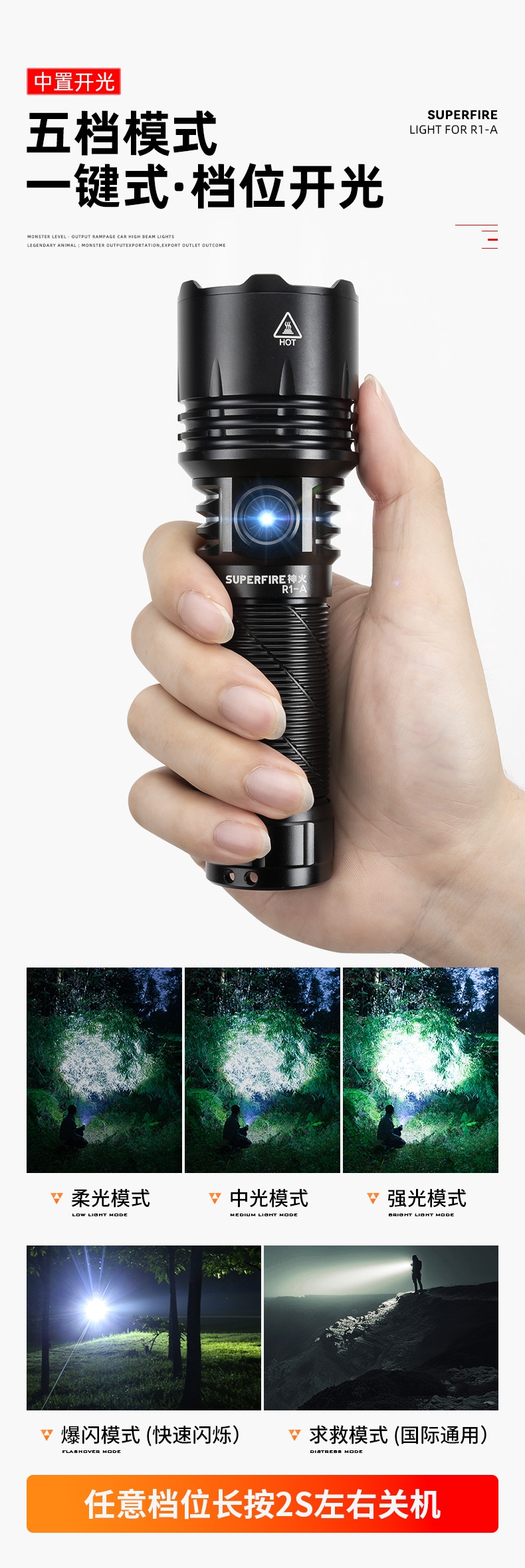 1、千米远射,射程更远,光斑更聚焦。 2、进口灯珠,亮度高,照明效果更好。 3、前后双按键,光源一键点亮,高亮瞬间开启。