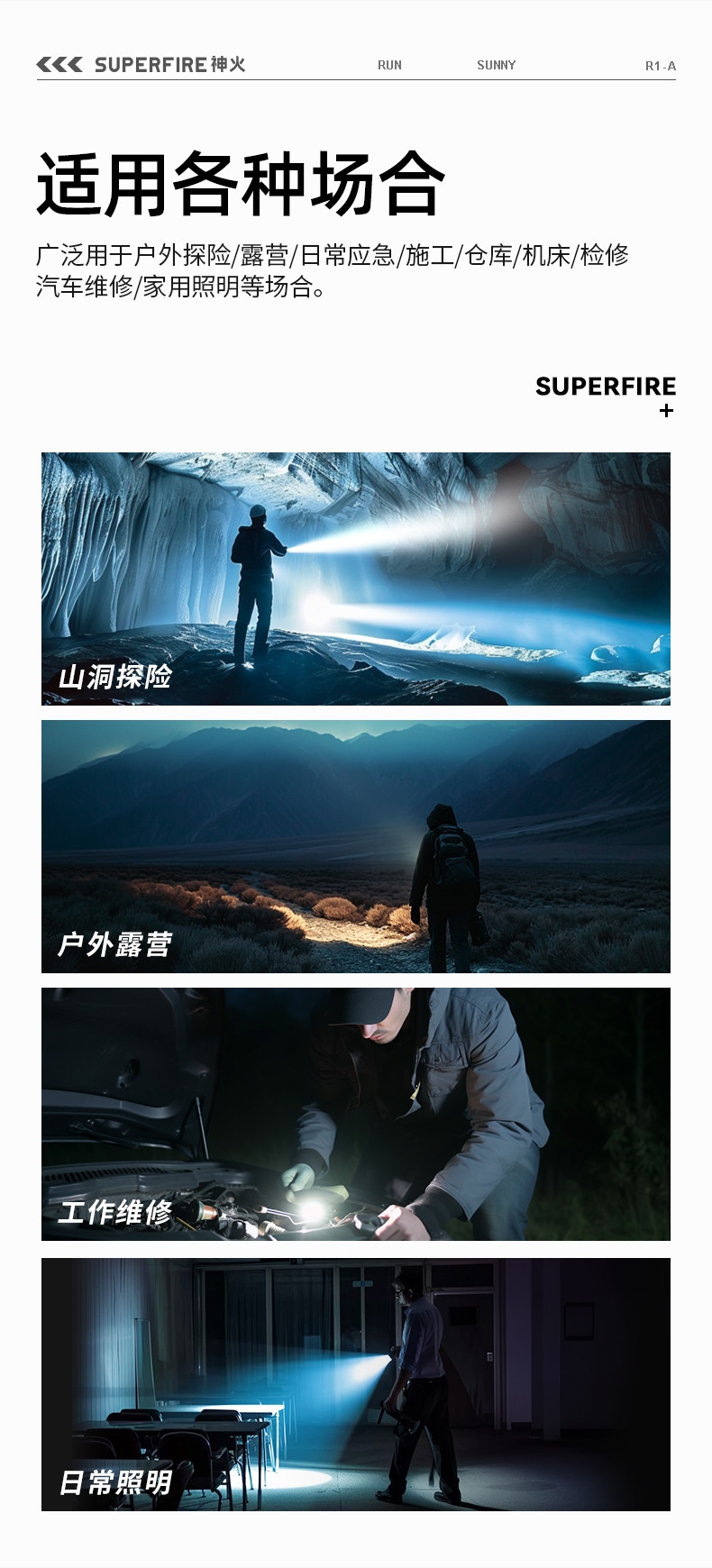 强光亮度,运动头灯,前后均衡设计,轻便不压头,可调节式头灯带,佩戴方便舒适,伸缩调焦,光照范围大,照射距离远,头灯角度调节,超90度角度随意调节,适宜各种环境使用