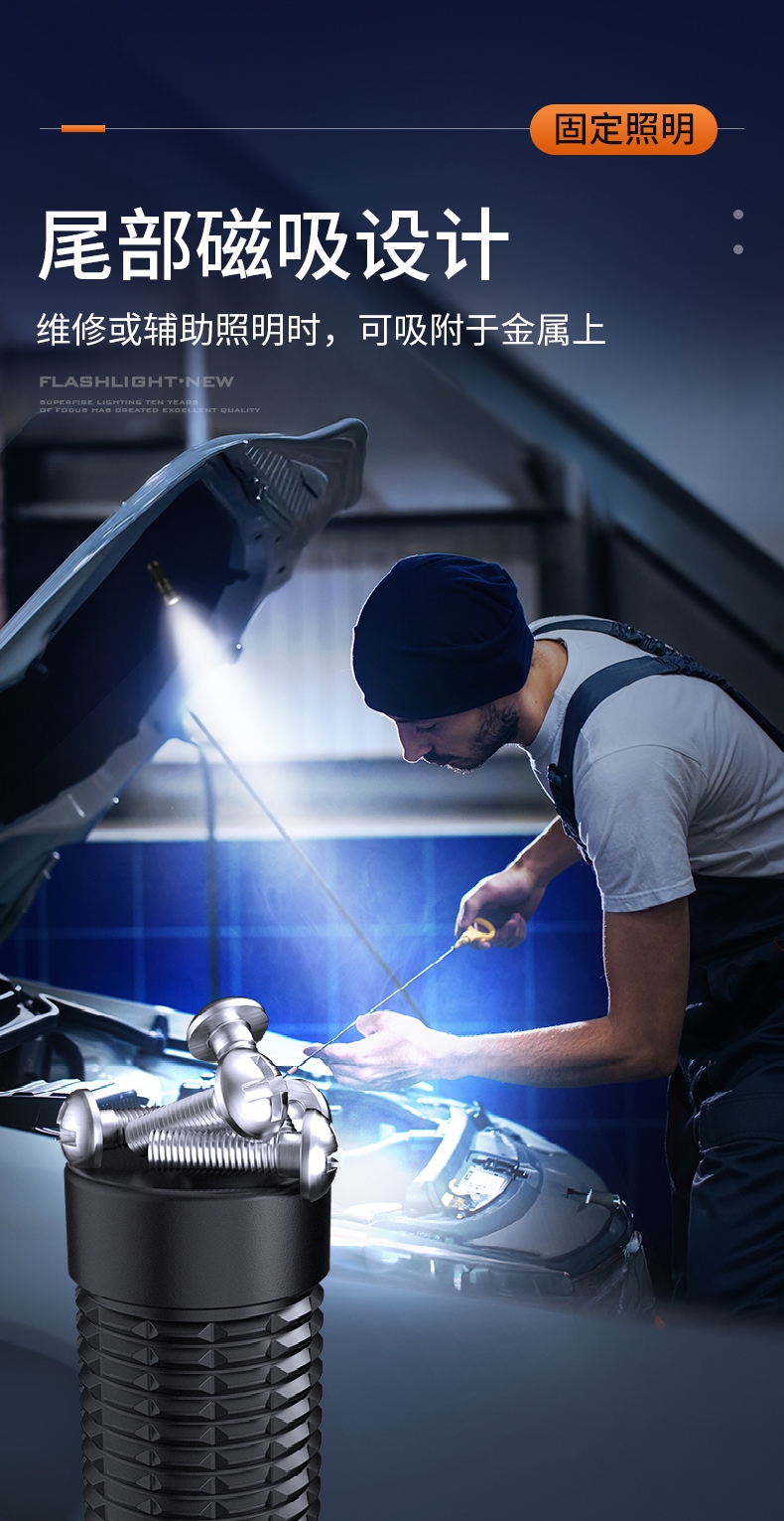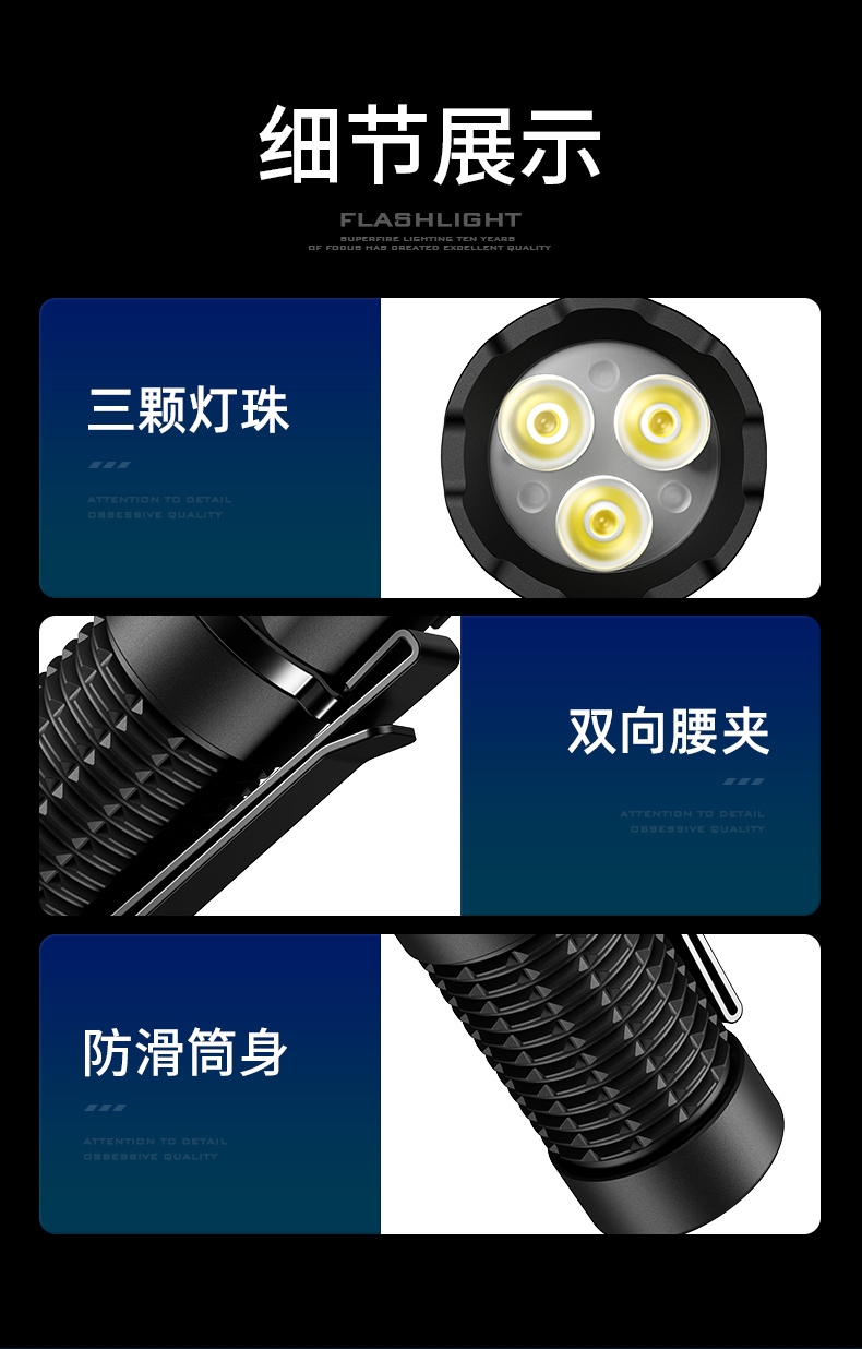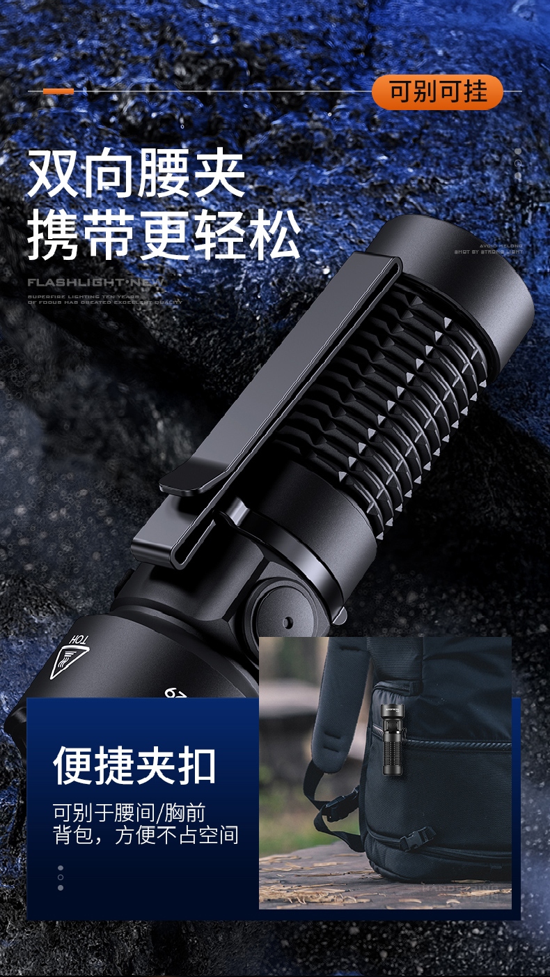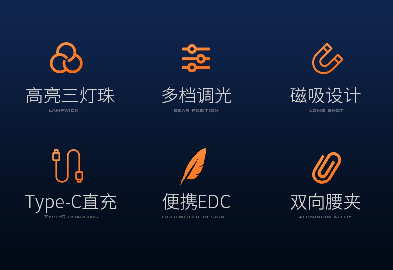 1、EDC定焦小手电,单手操控,简单方便;2、3颗高亮灯珠、亮度高、照明效果更好;3、精致外观,含磁吸、双向腰夹,时尚小巧,方便携带。