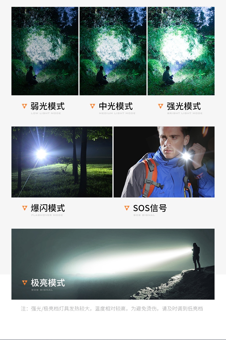 聚光主灯 亮度随心 轻按后端开关按钮,主灯强光点亮,续按依次切换主灯工作光-爆闪光。主灯开启状态下长按5秒,可实现光源色温转换。主灯关闭状态下长按5秒,可开启灯具最亮照明模式。 爆亮强光 亮如白昼 1500LM大功率高亮光源,点亮顷刻如白昼