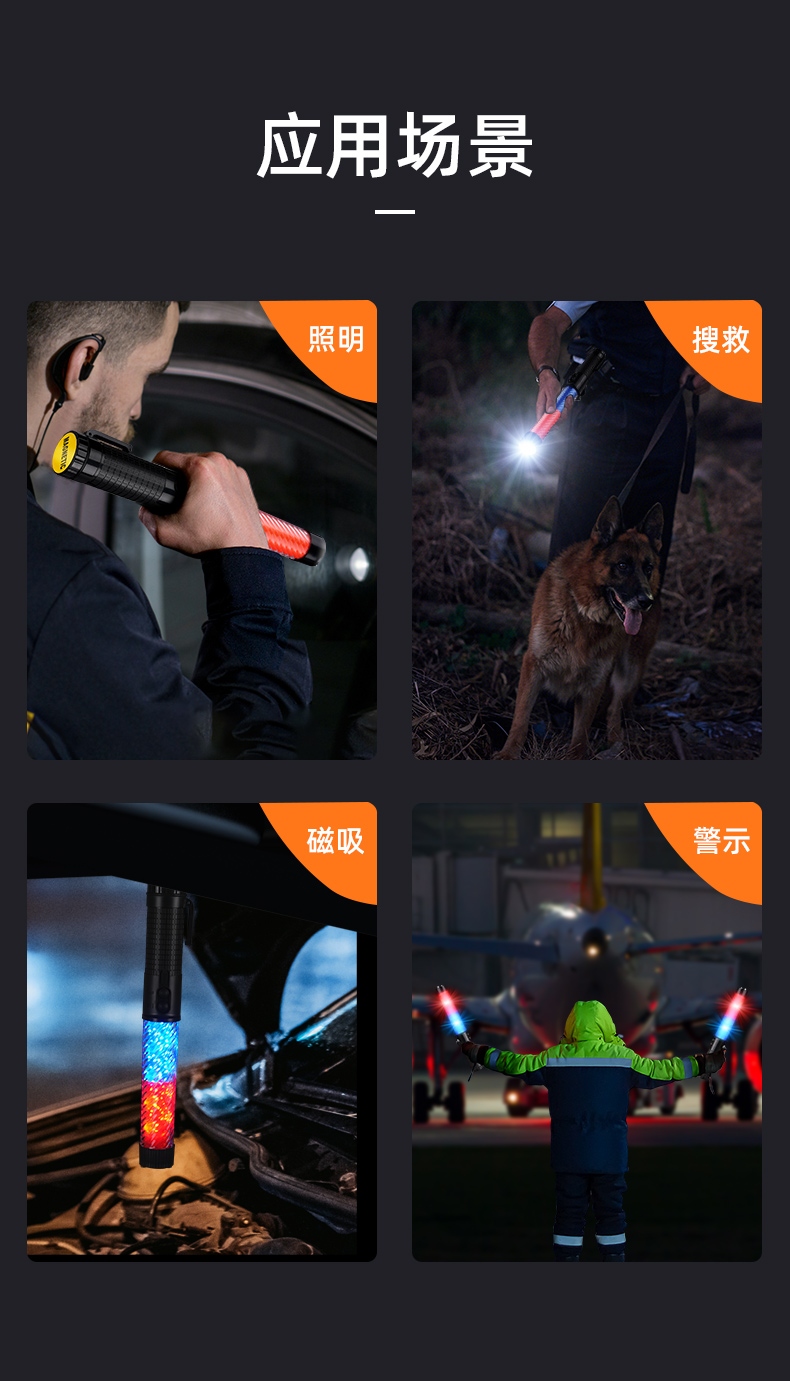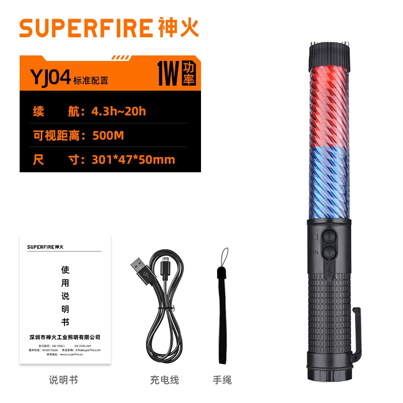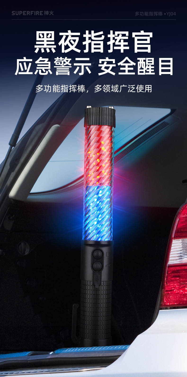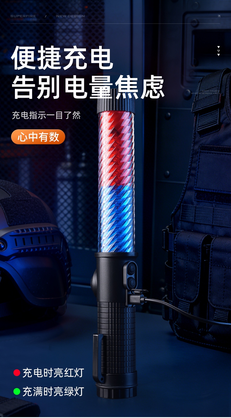 2,按压灯光键,挡位依次:红蓝慢闪-红蓝快闪-红蓝长亮-手电强光-手电爆闪-关闭;