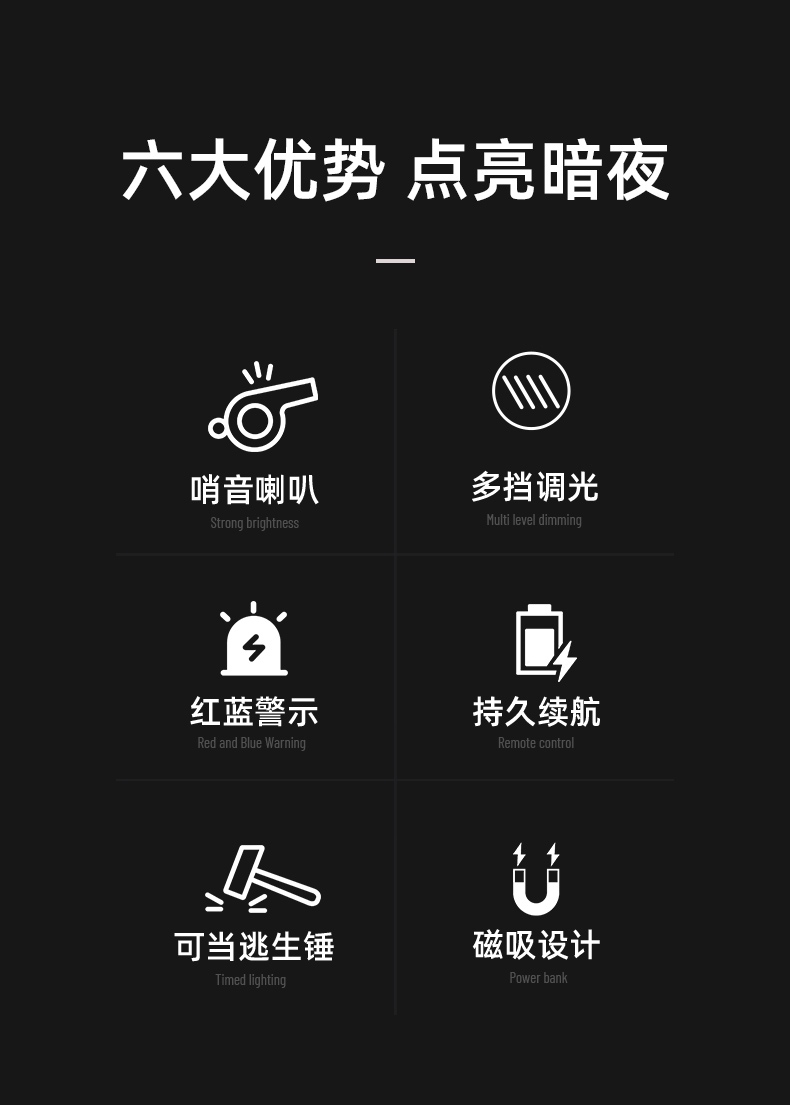 低压保护、磁吸安装、三档调光、逃生锤、手电筒、蜂鸣器