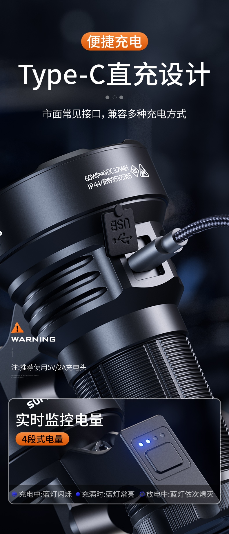 3、新型高亮远射灯珠,60W大功率,亮度高,照明效果好。