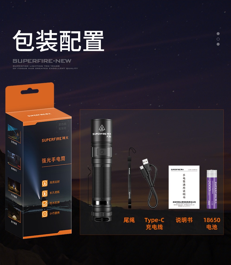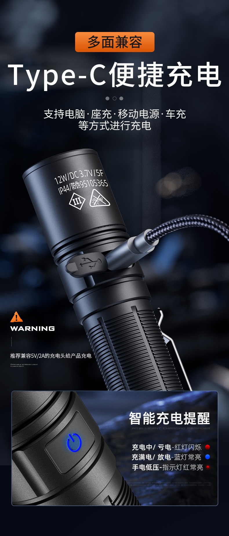 四档调光 Type-C充电 电量显示 铝合金筒身 持久续航 强力防水