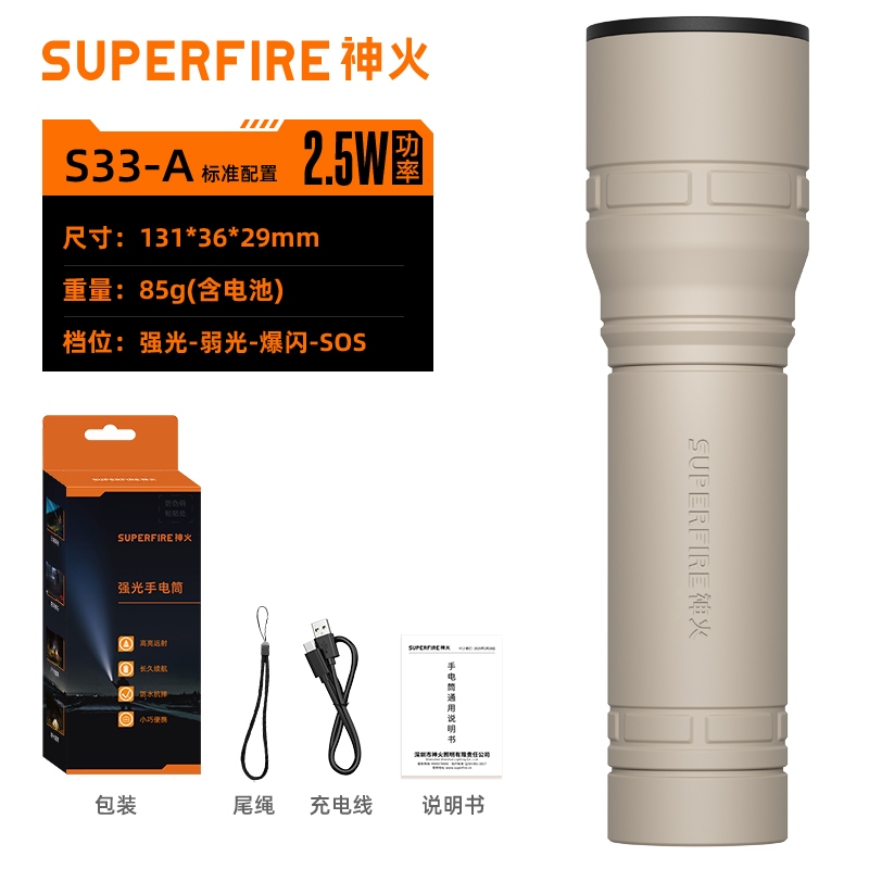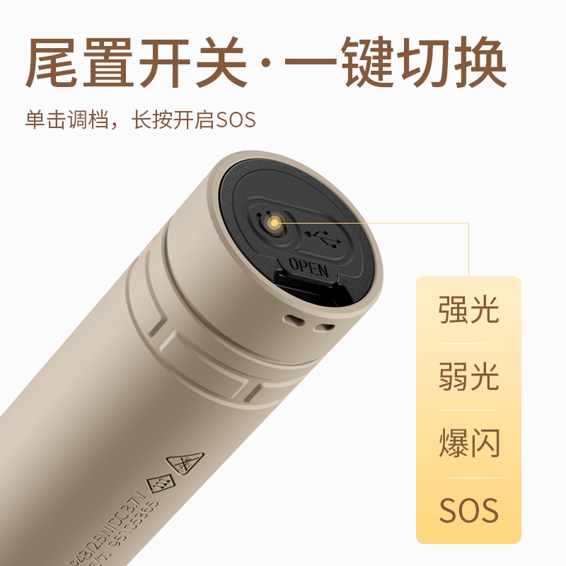 1、按压尾置开关按键即开启强光档,续按调档(强光-弱光-爆闪-关)可循环换挡。任何挡位长按3秒左右开启 SOS挡位,续按关闭. 2、小巧便携,重量轻,携带更方便。 3、小USB充电接口,充电更方便。