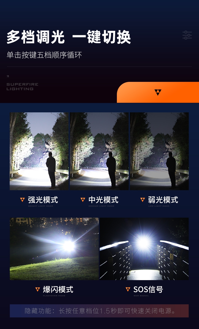 1、六档调光,可满足不同使用场景下的照明需求。 2、进口高亮朗明纳斯灯珠,照明效果更好。 3、含档位记忆,任意档位快捷关机 ,开机恢复关机前档位。