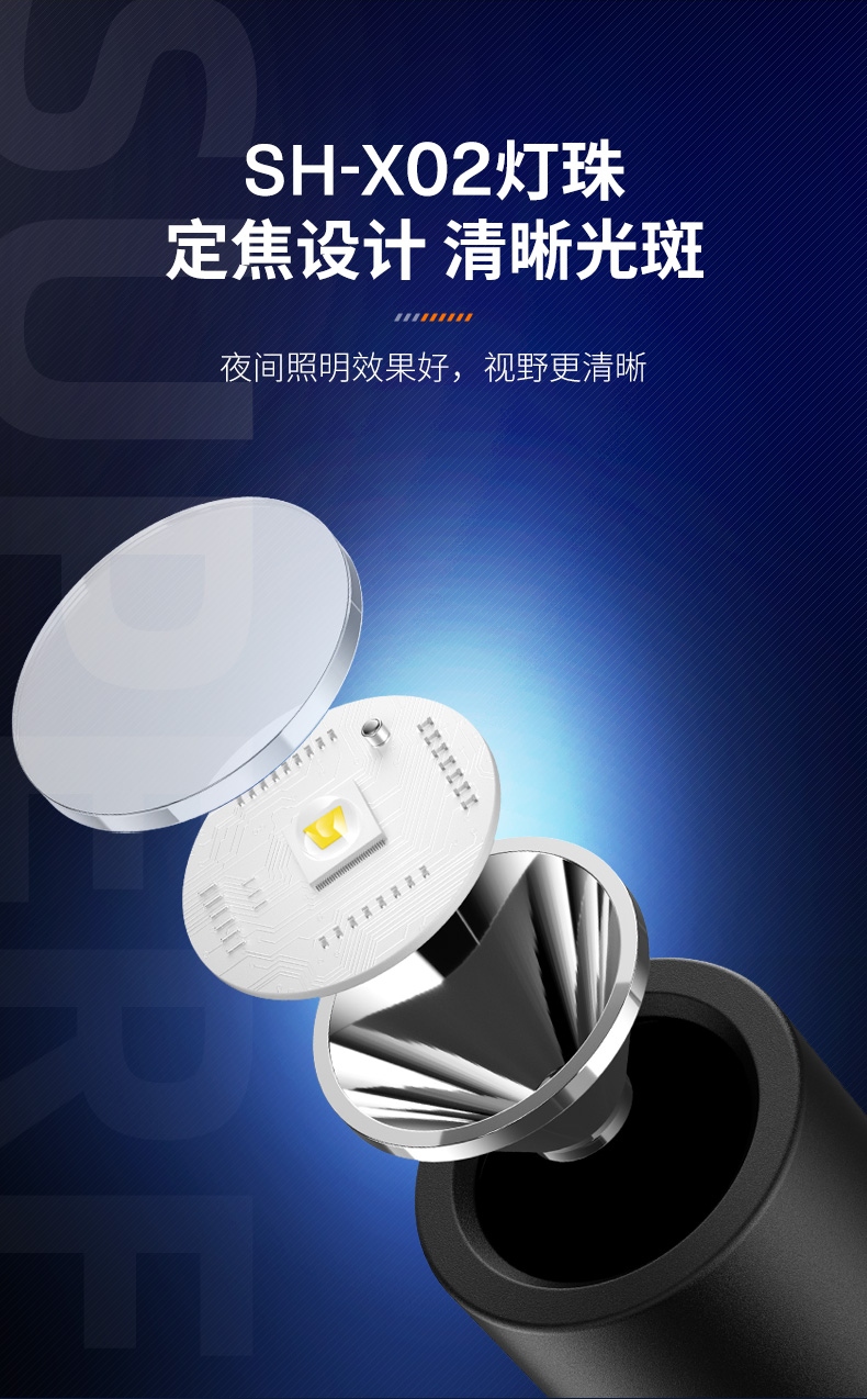 1、千米远射,射程更远,光斑更聚焦。 2、进口灯珠,亮度高,照明效果更好。 3、前后双按键,光源一键点亮,高亮瞬间开启。