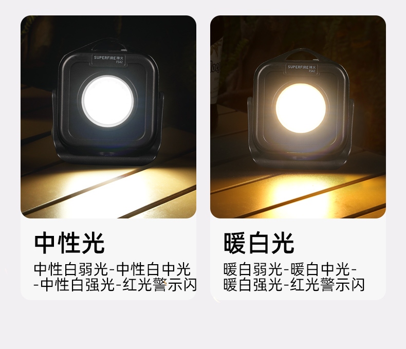 本灯具设有两个独立开关,一个控制灯光挡位,一个控制色温切换,具体操作如下: 按压开关开启灯具,挡位顺序依次为:弱光-中光-强光-红光警示闪-关闭 在灯具开启状态下,按压色温按钮可实现冷白,中性白,暖白三种色温切换。