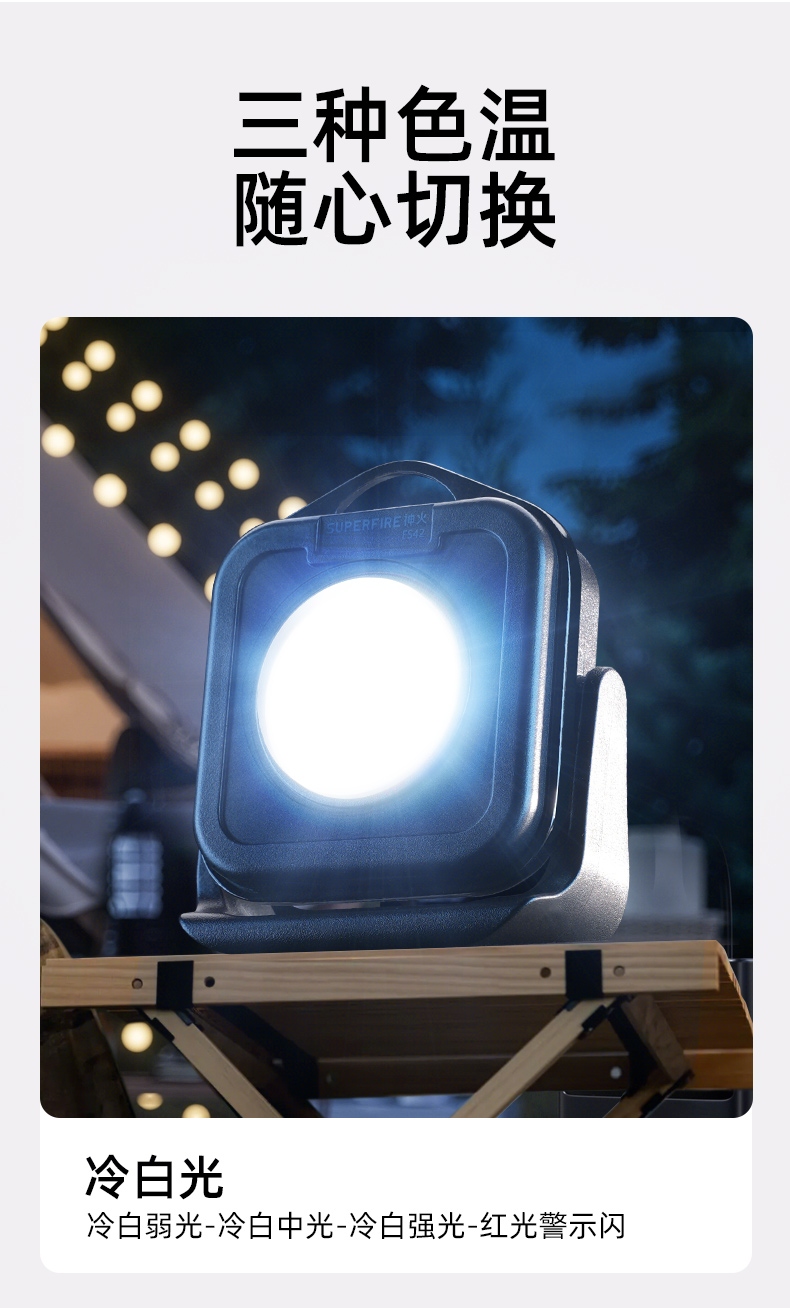 1、多档调光,可满足不同使用场景下的照明需求; 2、含提手,握感更舒适。携带更简单; 3、新型高亮远射灯珠,60W大功率,亮度高,照明效果好。