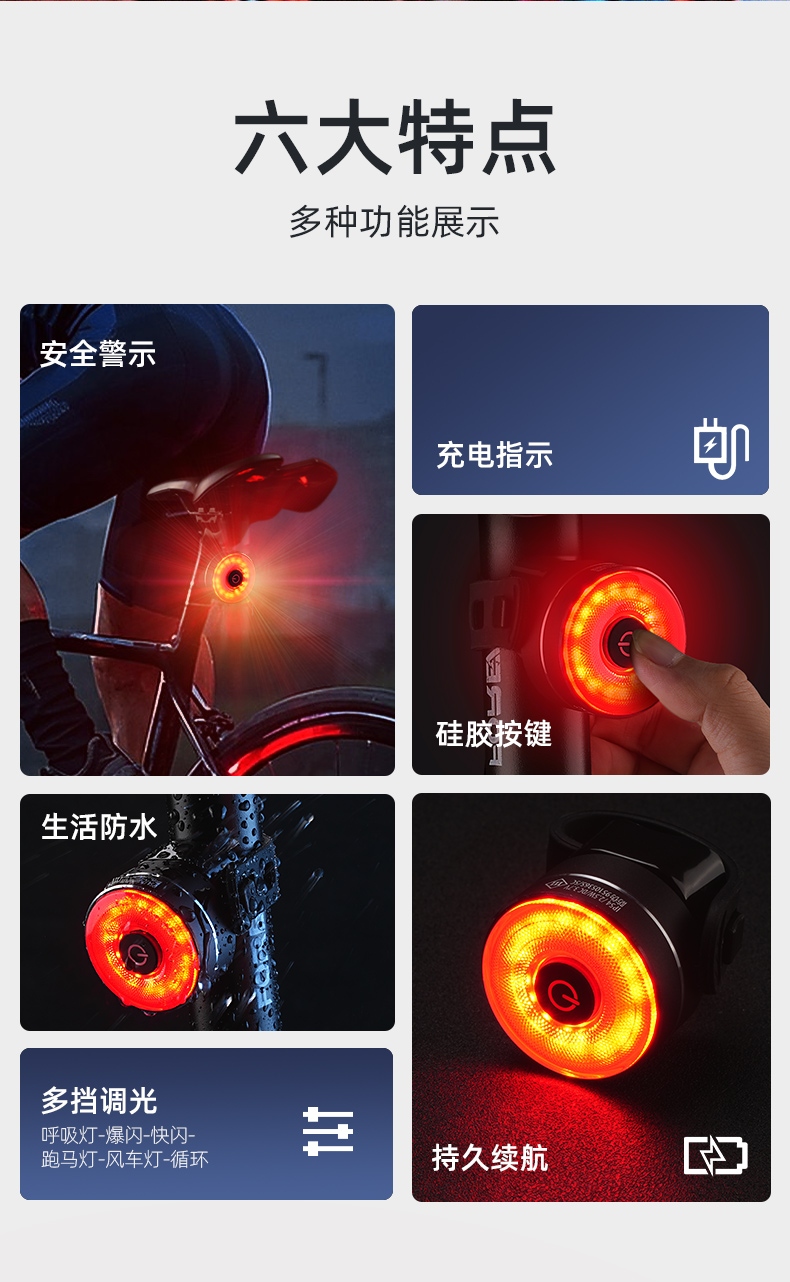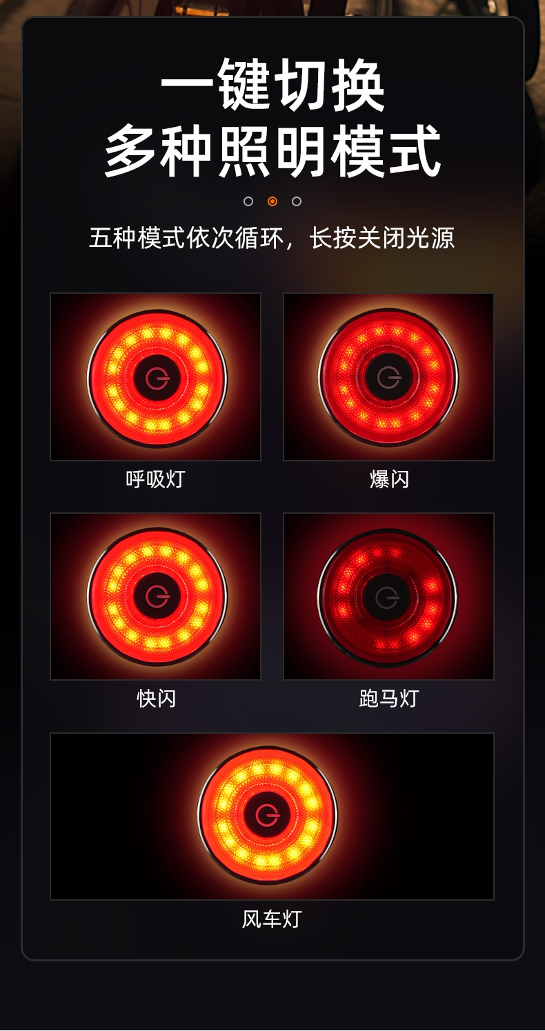 1,按开关键开启光源,挡位依次:呼吸灯-爆闪-快闪-跑马灯-风车灯-循环,任意挡位下长按关闭。灯具自带挡位记忆功能,再次开启时为之前关闭挡位; 2、充电时指示灯为红色,充满为绿色常亮。