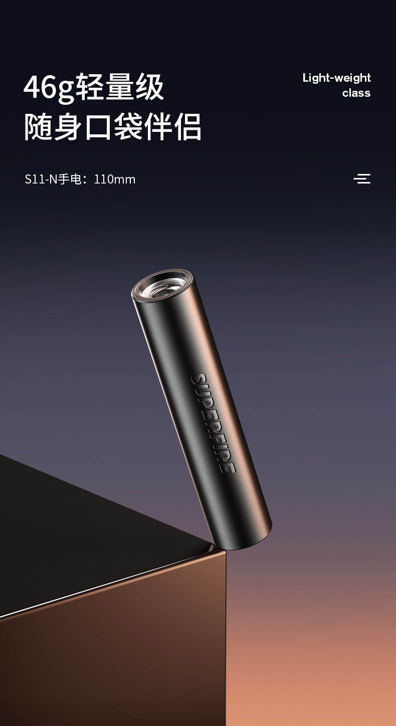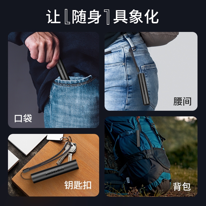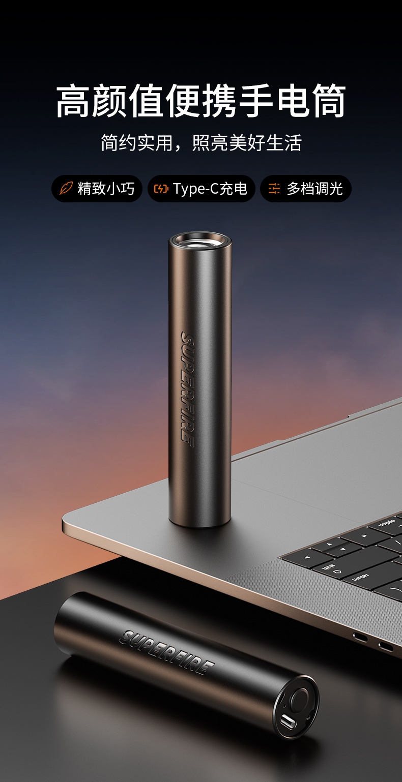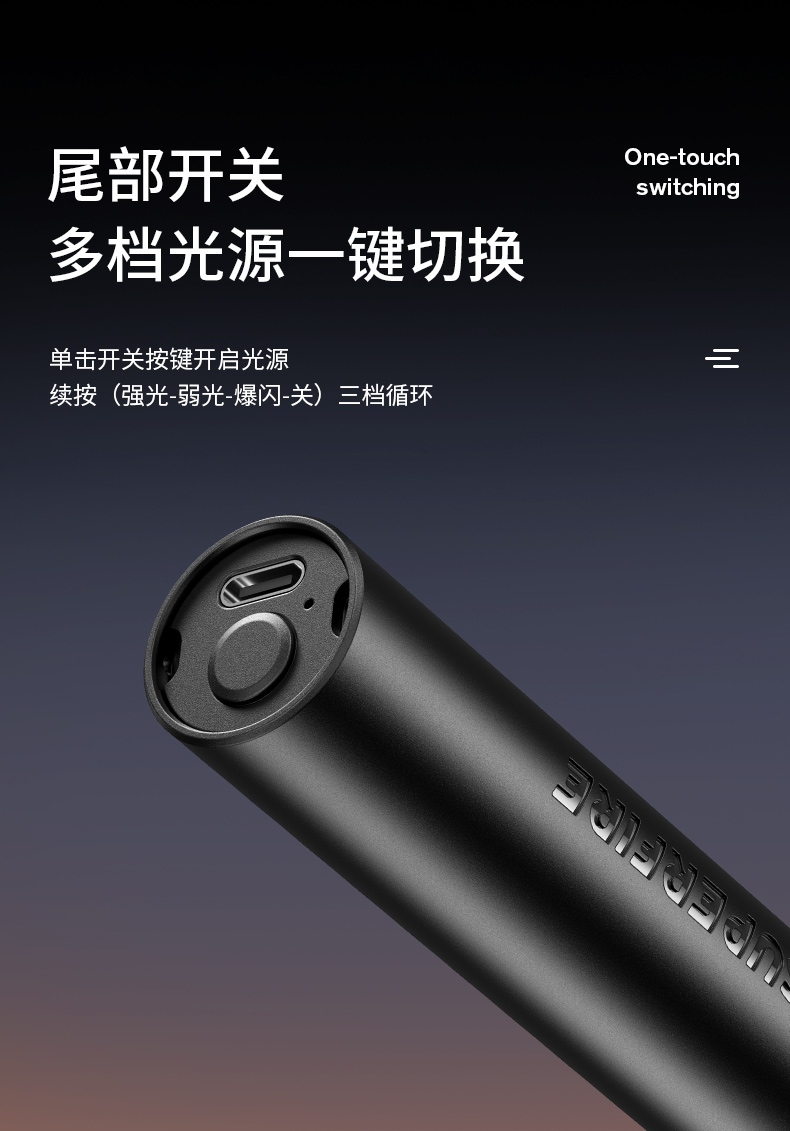 1、多档调光,可满足不同使用场景下的照明需求。 2、精致外观,时尚小巧。 3、定焦手电,单手操控,简单方便。