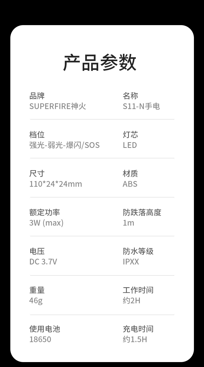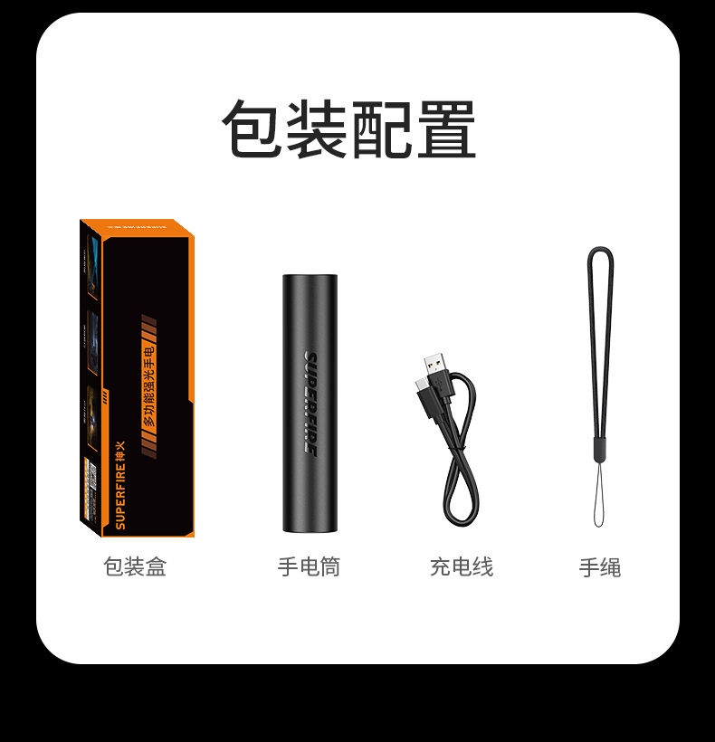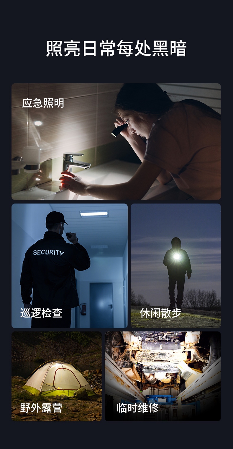 1、多档调光,可满足不同使用场景下的照明需求。 2、精致外观,时尚小巧。 3、定焦手电,单手操控,简单方便。