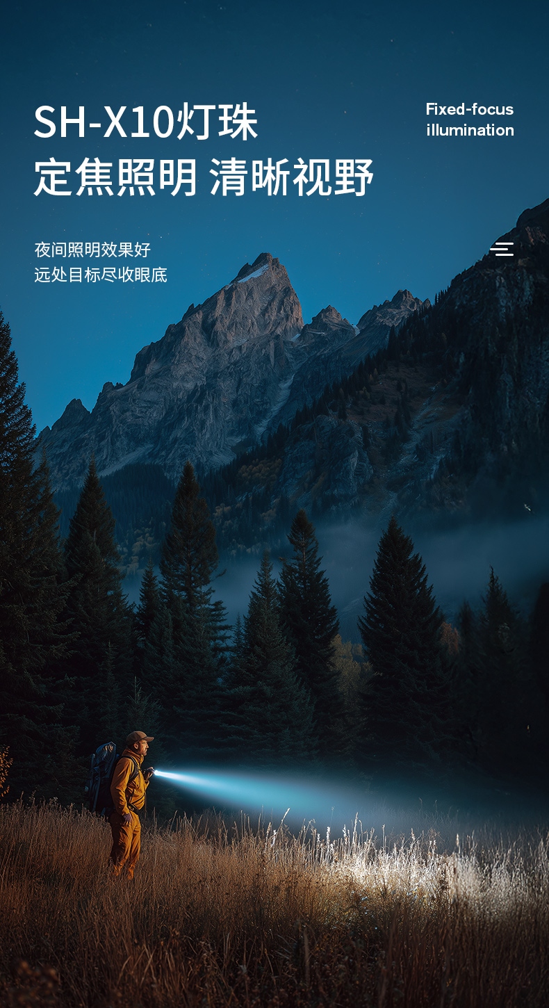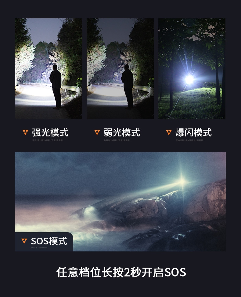 聚光主灯 亮度随心 轻按后端开关按钮,主灯强光点亮,续按依次切换主灯工作光-爆闪光。主灯开启状态下长按5秒,可实现光源色温转换。主灯关闭状态下长按5秒,可开启灯具最亮照明模式。 爆亮强光 亮如白昼 1500LM大功率高亮光源,点亮顷刻如白昼