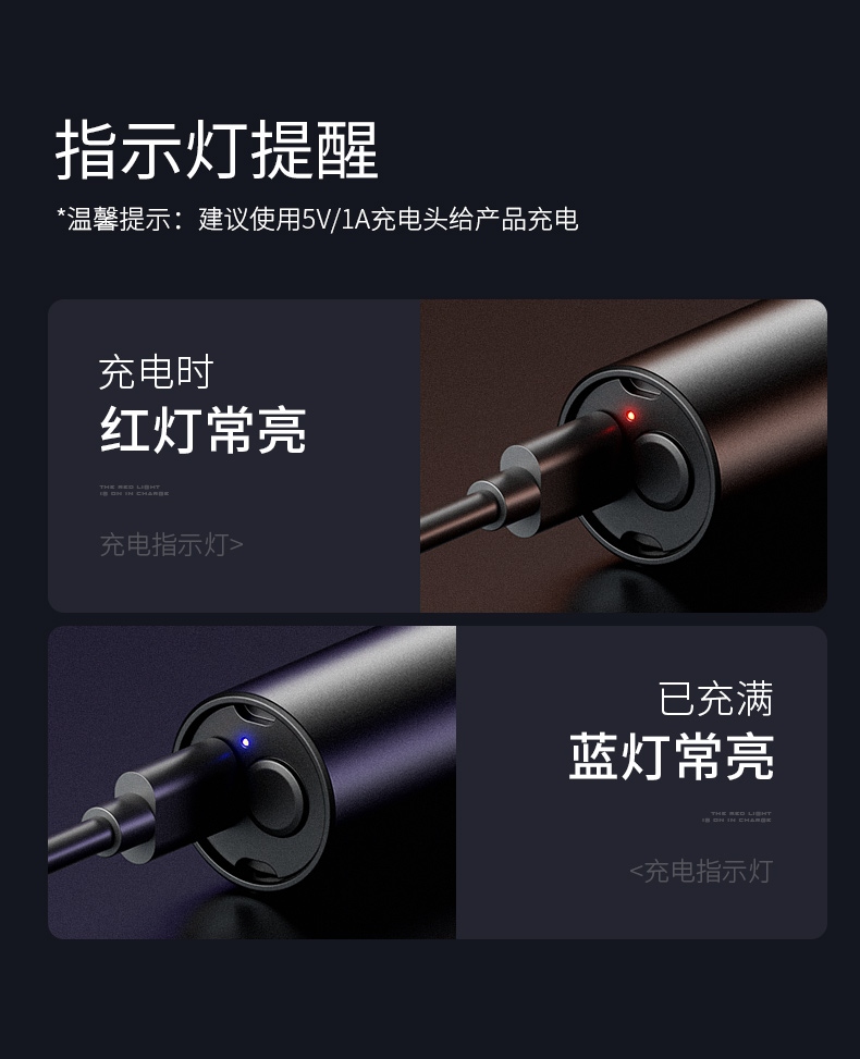 1.单击左边开关开启感应功能,同时开启强光档,续按关闭感应功能(关闭感应功能,光源不会关闭),当感应功能开启时,单击右边开关可正常调节档位。 2.多样化充电,使用方便:设有Type-c充电口,可使用充电器、充电宝、电脑等设备为灯具充电。 3.电量显示:实时