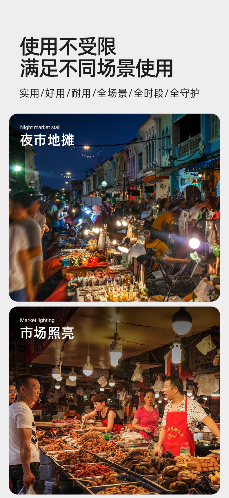 1、多档调光,可满足不同使用场景下的照明需求; 2、含提手,握感更舒适。携带更简单; 3、新型高亮远射灯珠,60W大功率,亮度高,照明效果好。
