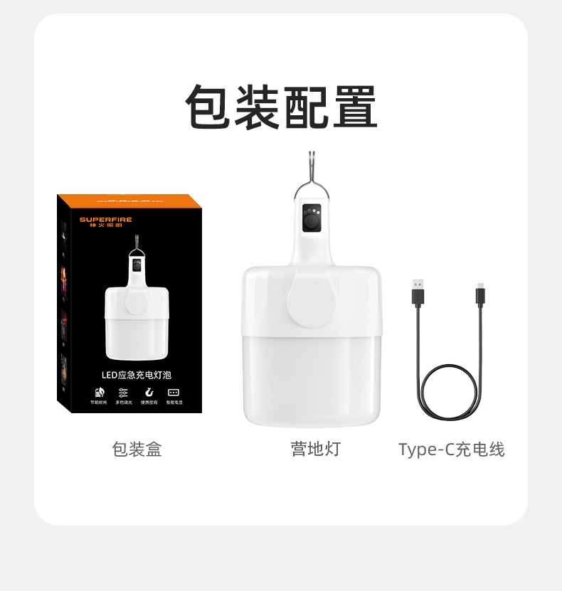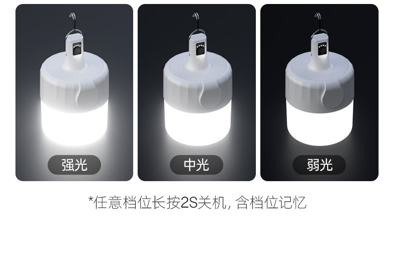 1.按压灯头开关按钮开启即强光档,续按调档。3个档位,以强光-中光-弱光-关依次循环,任意档位长按2S关机,含档位记忆。 2.多样化充电,使用方便:可使用充电器、充电宝、电脑等设备为灯具充电。充电时可边充电边使用照明功能 3.此灯头部带有提手挂耳
