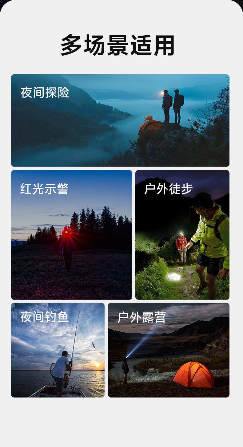 1.五档一体:强中弱、爆闪、SOS自由切换,可满足不同场景下的使用需求 。 2.此款头灯带有红常亮-红光爆闪,可作警示作用。 3.可调节式松紧带:佩戴方便舒适。
