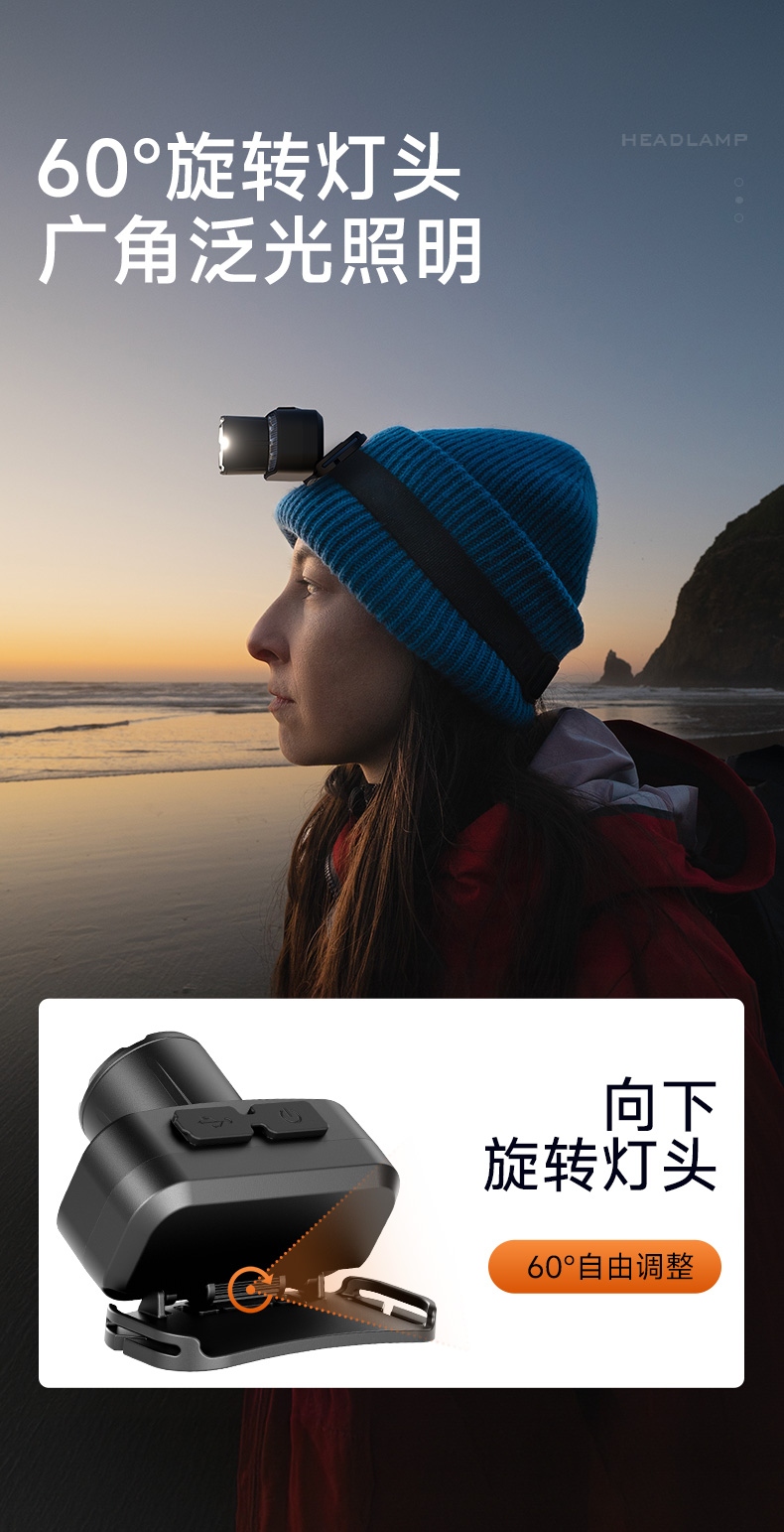 4.头灯角度调节:超60°角度随意调节,适宜各环境使用。