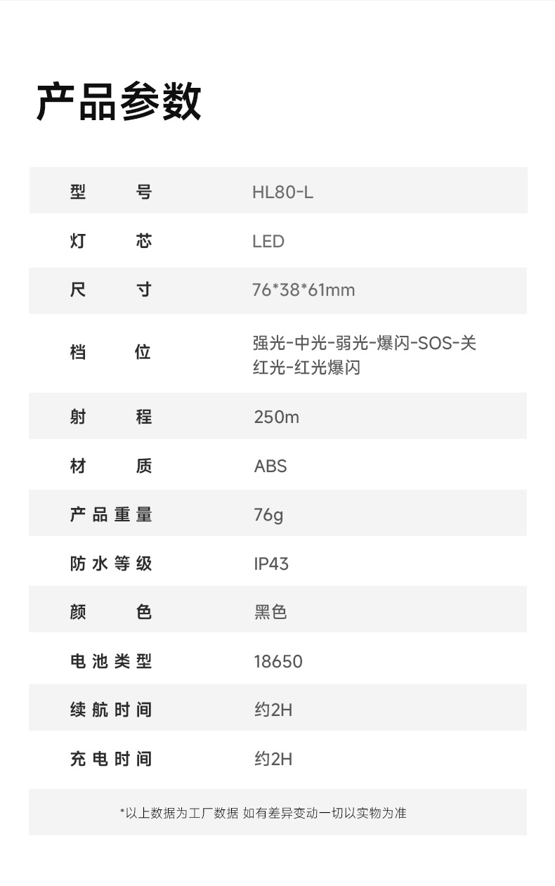 1、千米远射,射程更远,光斑更聚焦。 2、进口灯珠,亮度高,照明效果更好。 3、前后双按键,光源一键点亮,高亮瞬间开启。