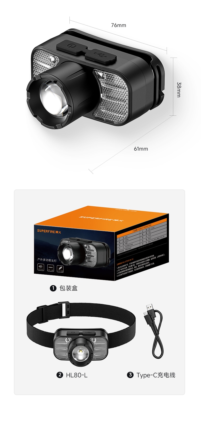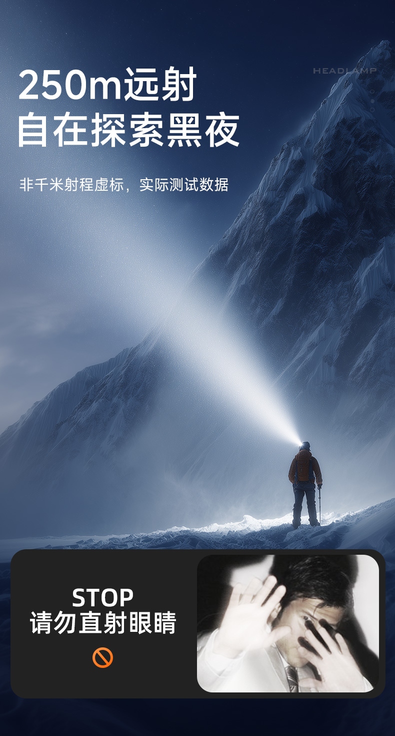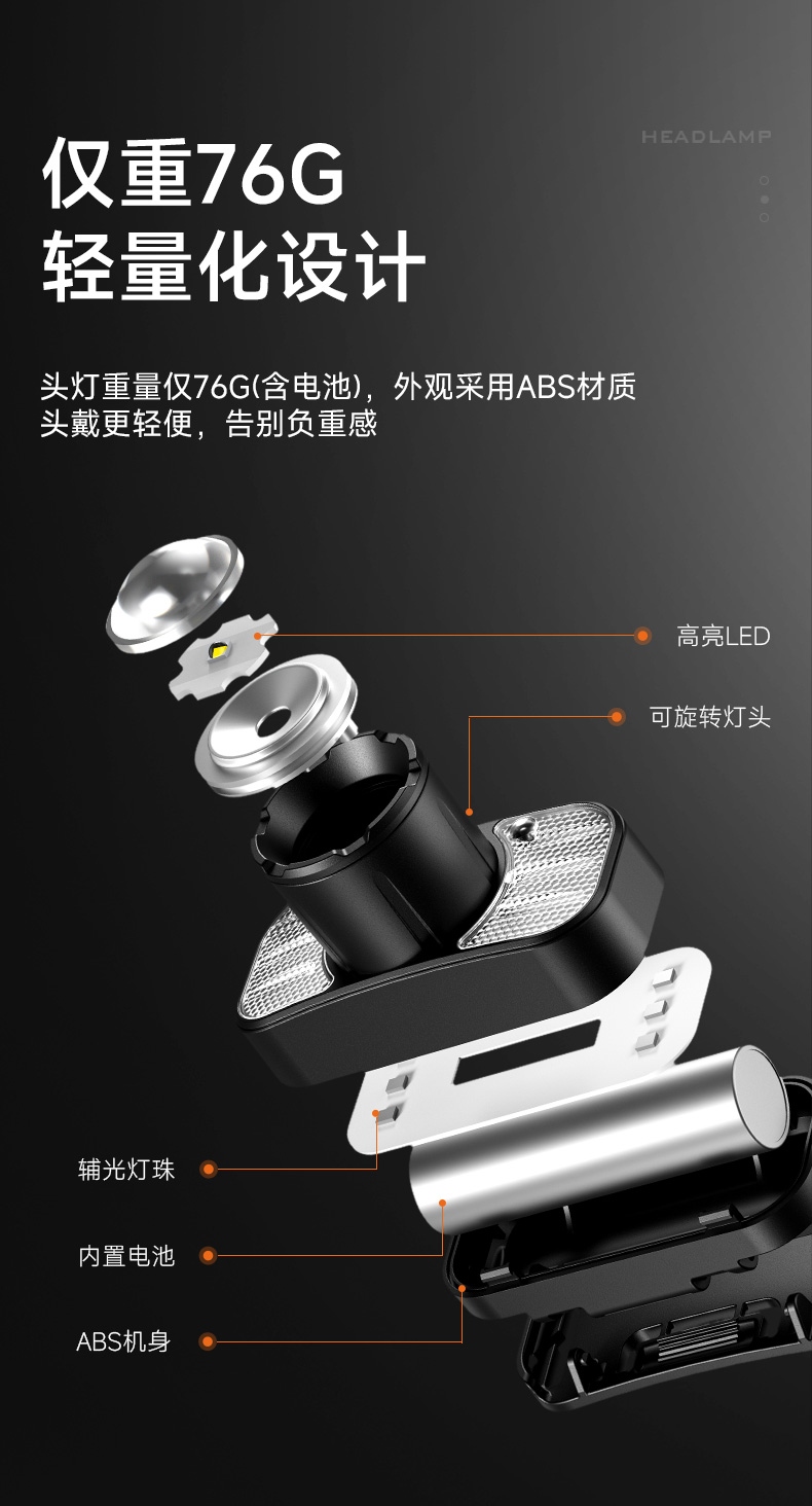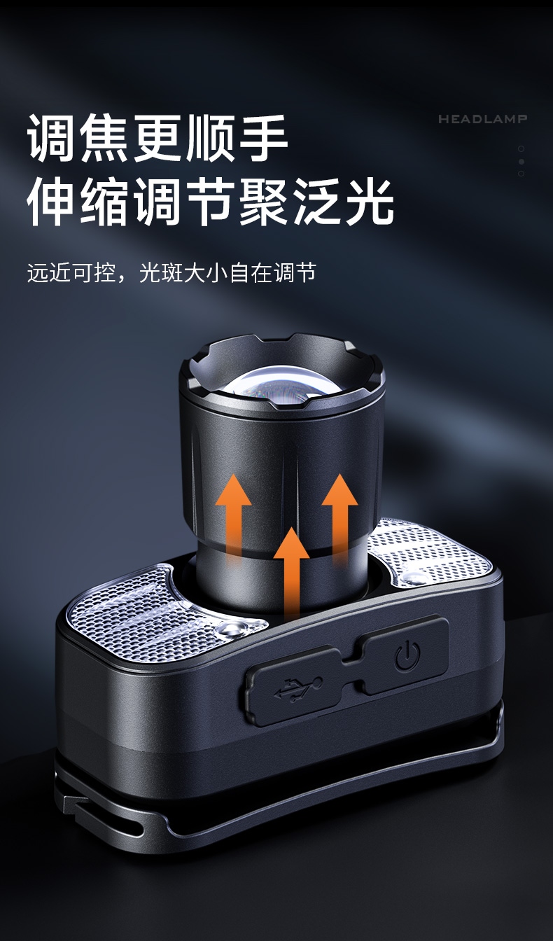 强光亮度,运动头灯,前后均衡设计,轻便不压头,可调节式头灯带,佩戴方便舒适,伸缩调焦,光照范围大,照射距离远,头灯角度调节,超90度角度随意调节,适宜各种环境使用