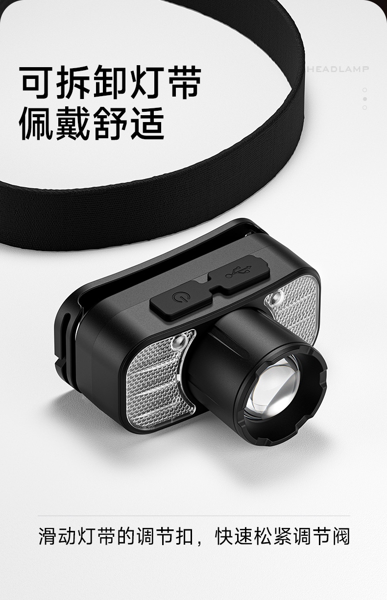 6.此款头灯款式潮流、设计小巧、携带方便、头带材质柔软、可自由拆卸、便于清洗。