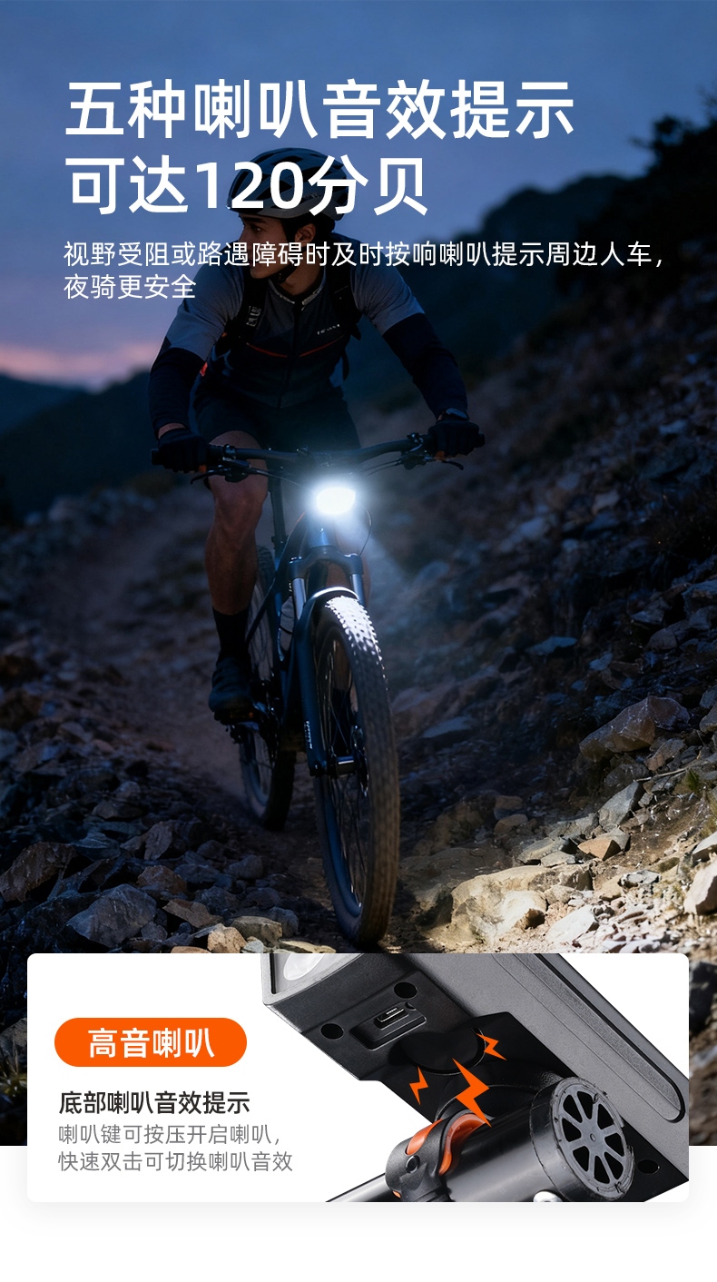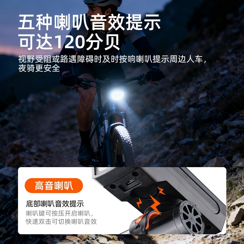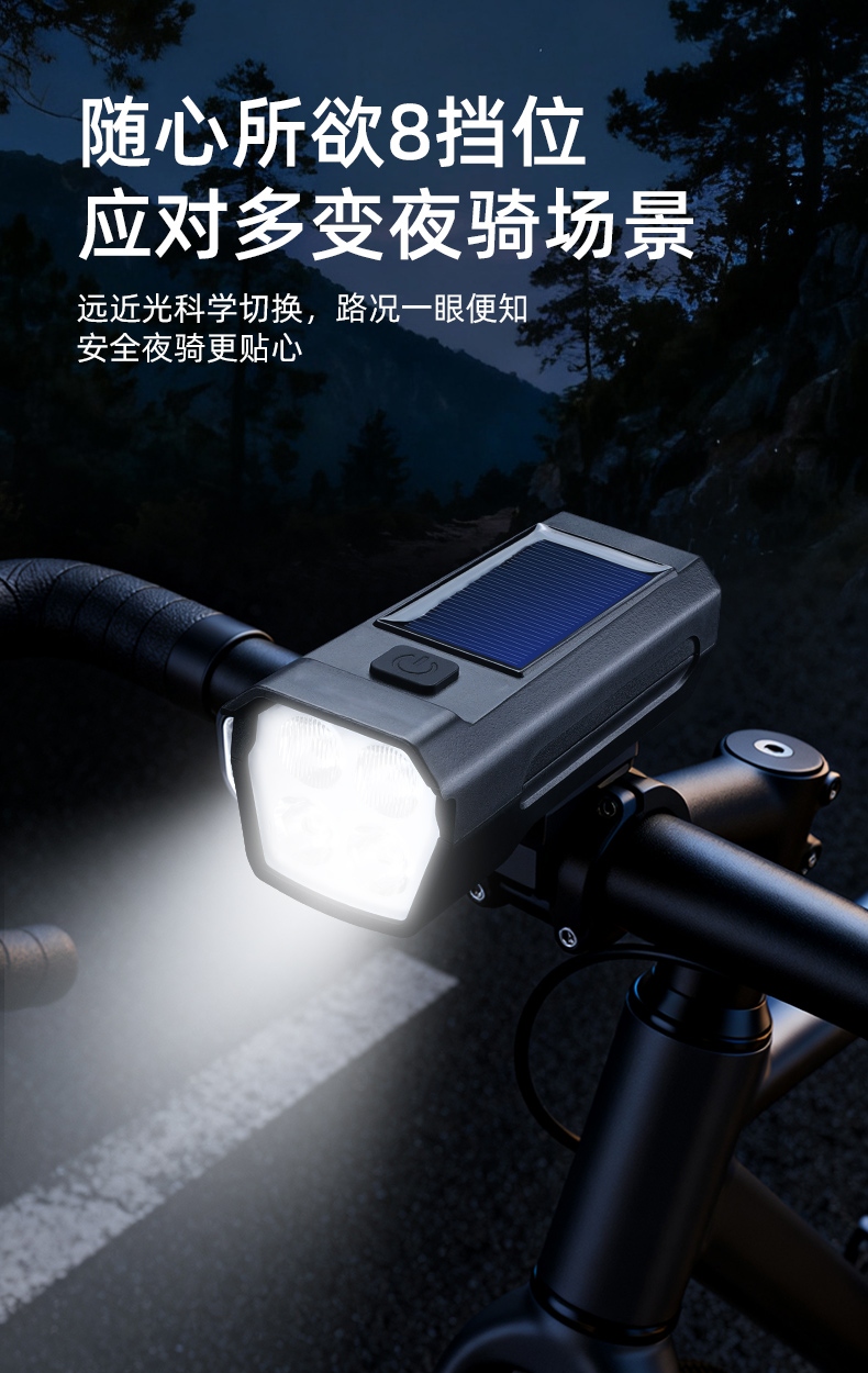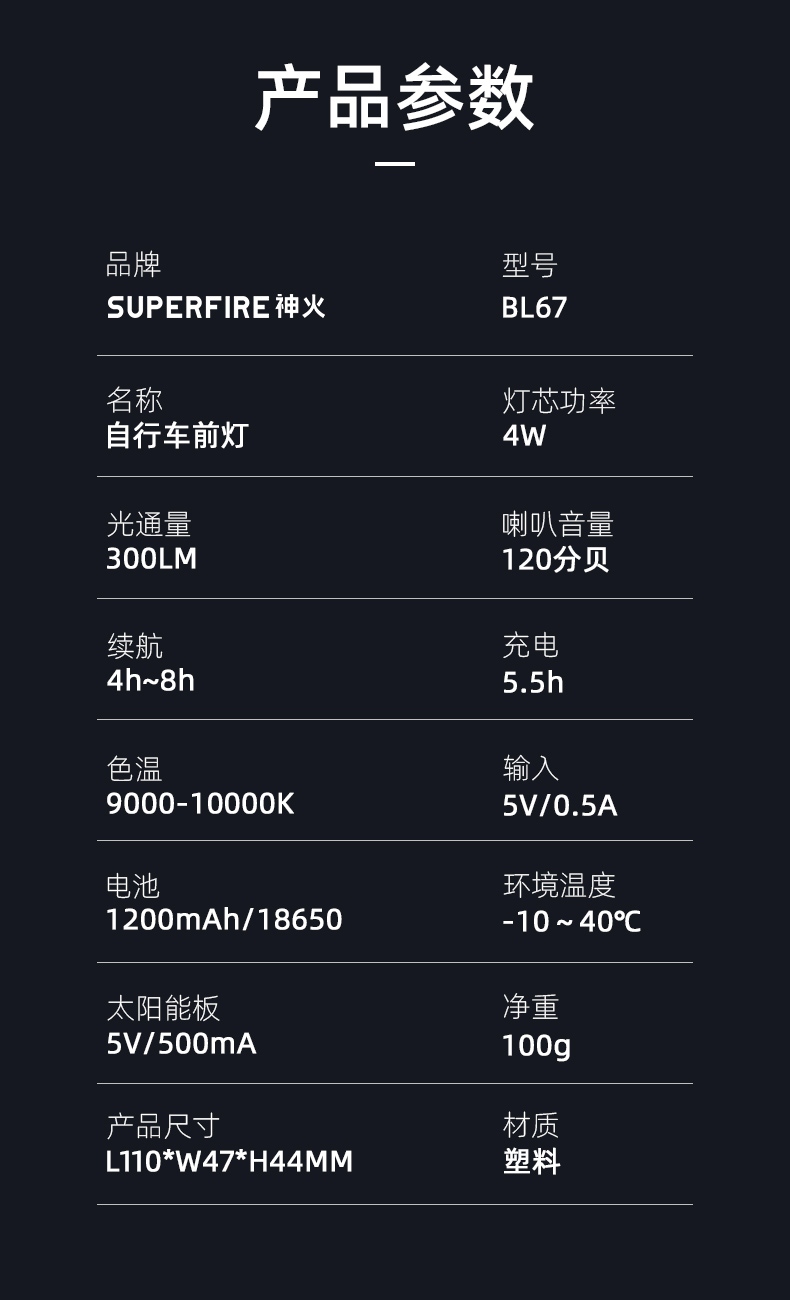 8挡灯光,5种喇叭音效(1米距离可达100分呗),太阳能充电,远近双光,有线遥控.