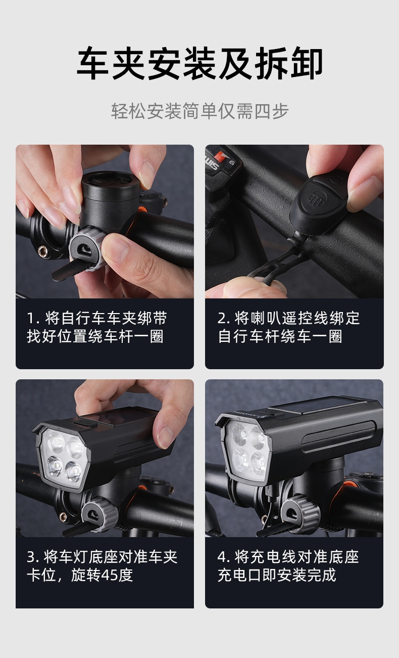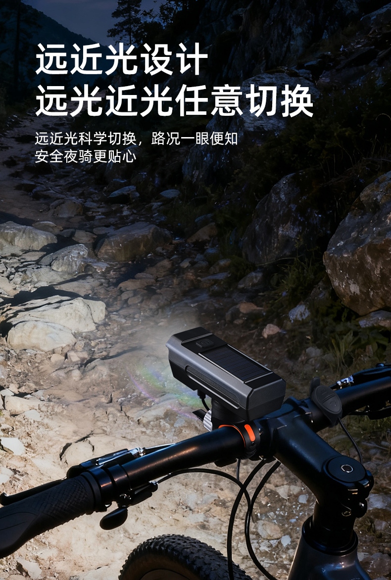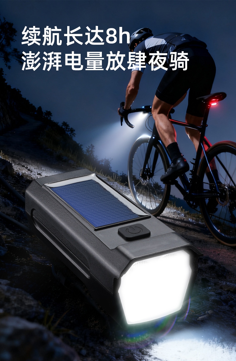 8挡灯光,5种喇叭音效(1米距离可达100分呗),太阳能充电,远近双光,有线遥控.
