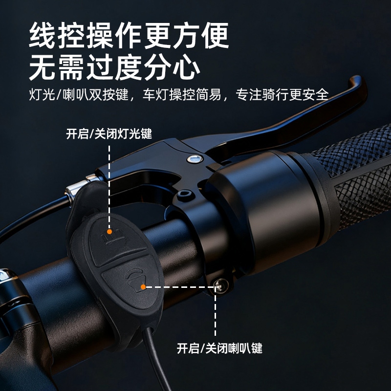 2,有线遥控器有两个按钮,其中灯光键和车灯按键一致,喇叭键可按压开启喇叭,快速双击可切换喇叭音效。