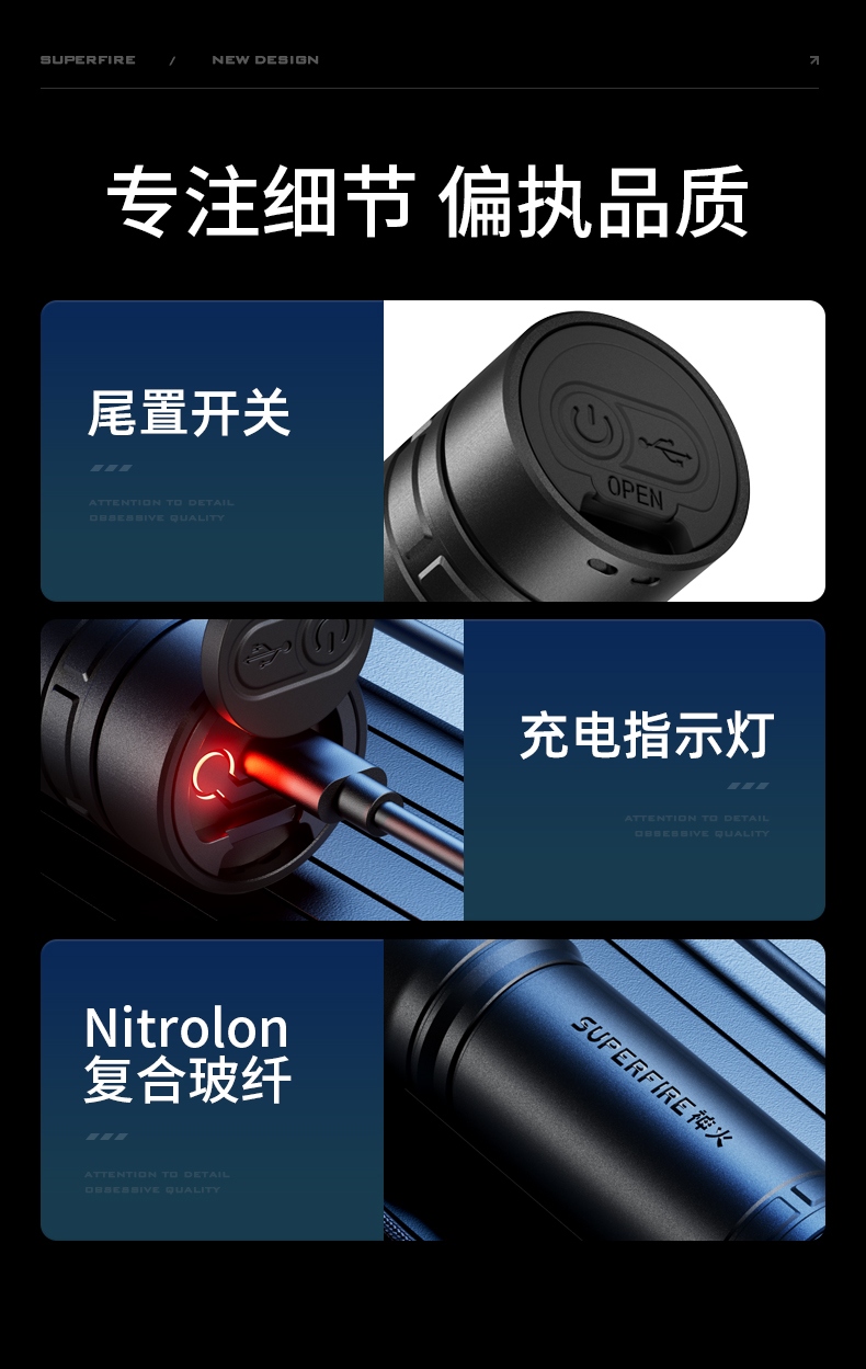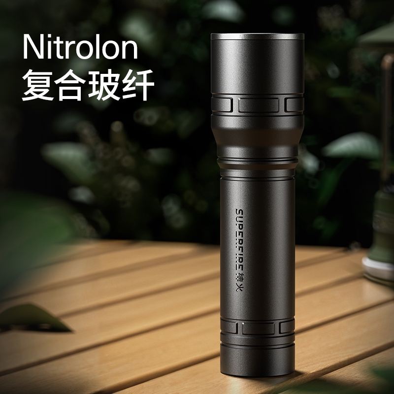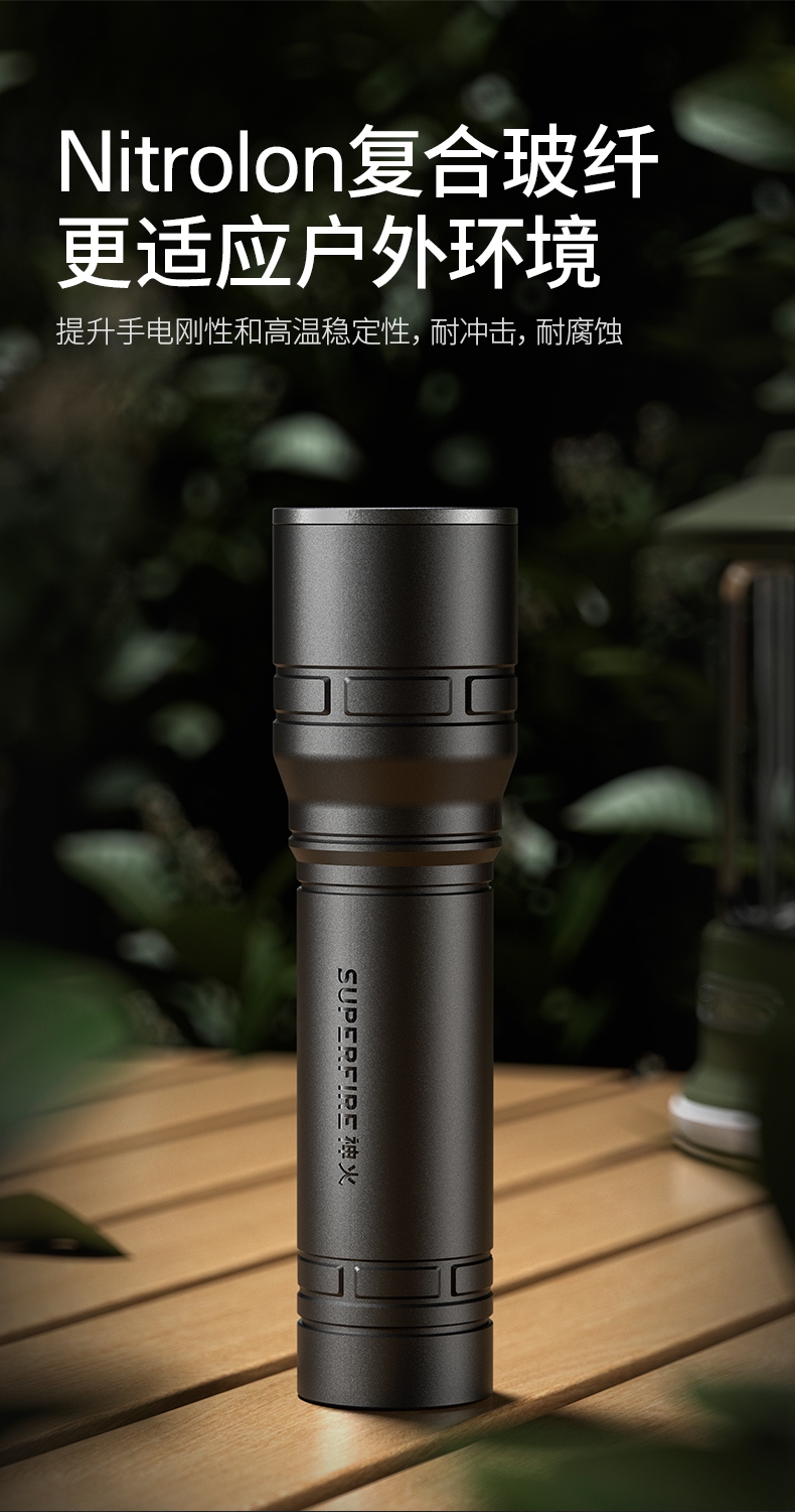 6、手电采用Nitrolon玻纤复合材质,增强产品刚性和高温稳定性,耐冲击,耐腐蚀。