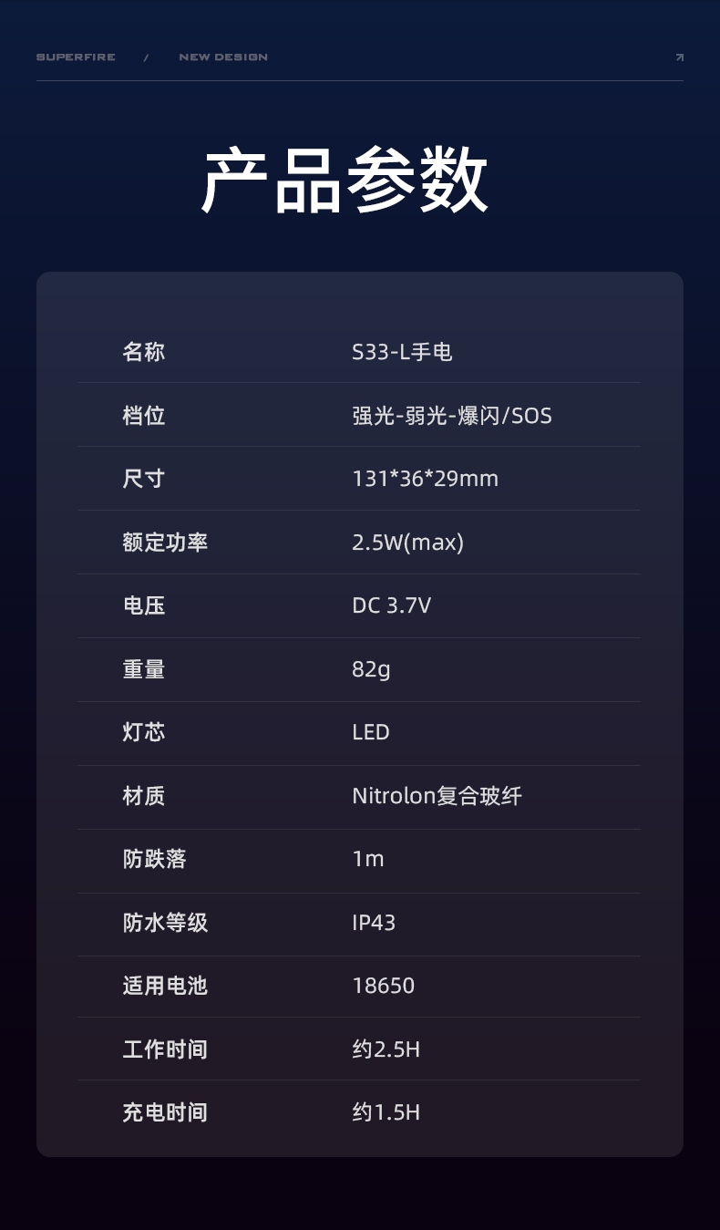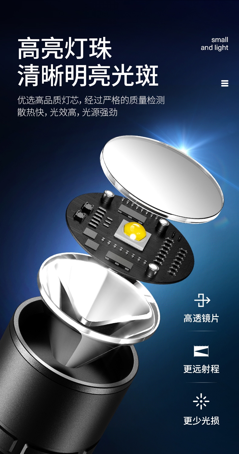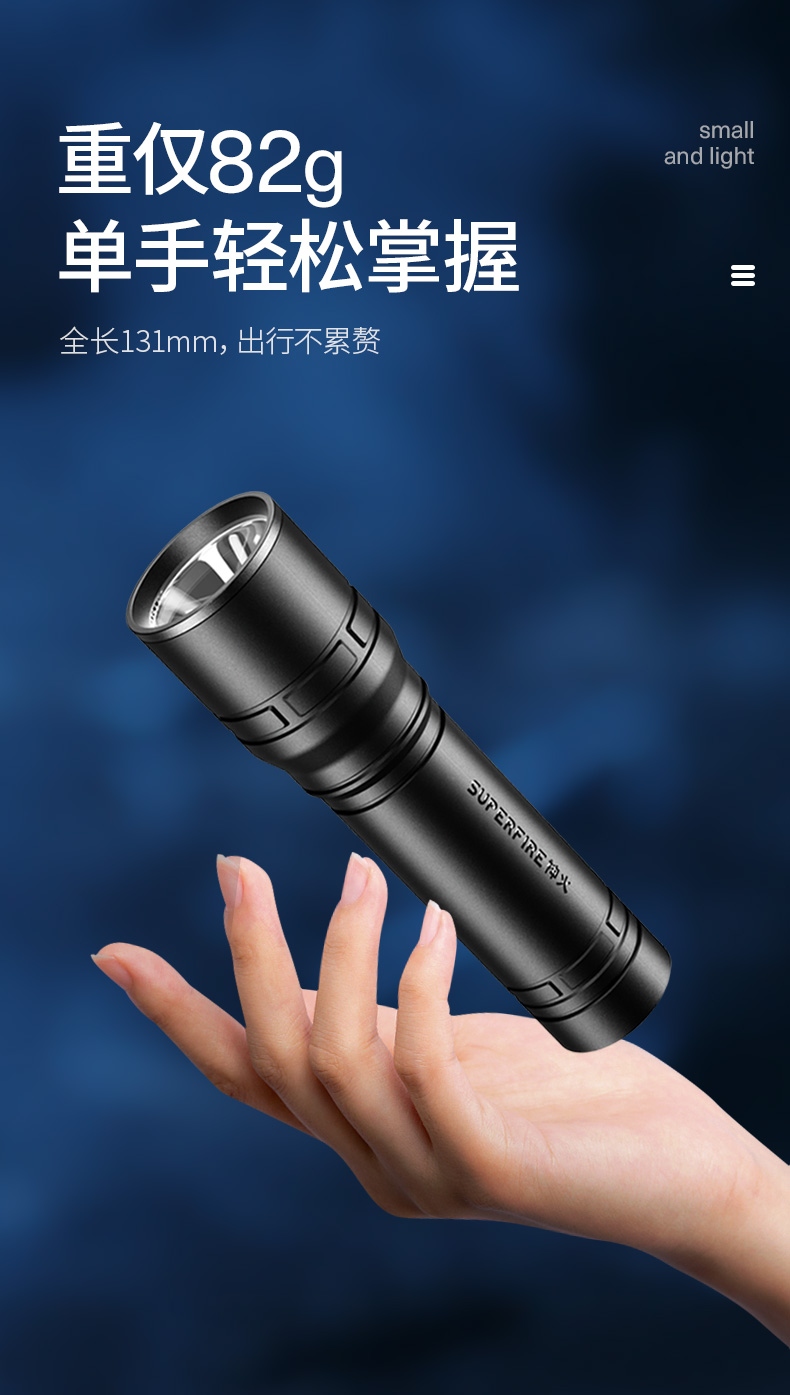 1、千米远射,射程更远,光斑更聚焦。 2、进口灯珠,亮度高,照明效果更好。 3、前后双按键,光源一键点亮,高亮瞬间开启。
