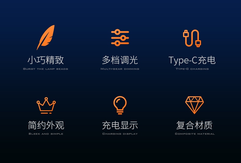 1、多档调光,颗满足不同环境下的使用需求。 2、小巧便携,重量轻,携带更方便。 3、Type-C 接口,充电更方便。