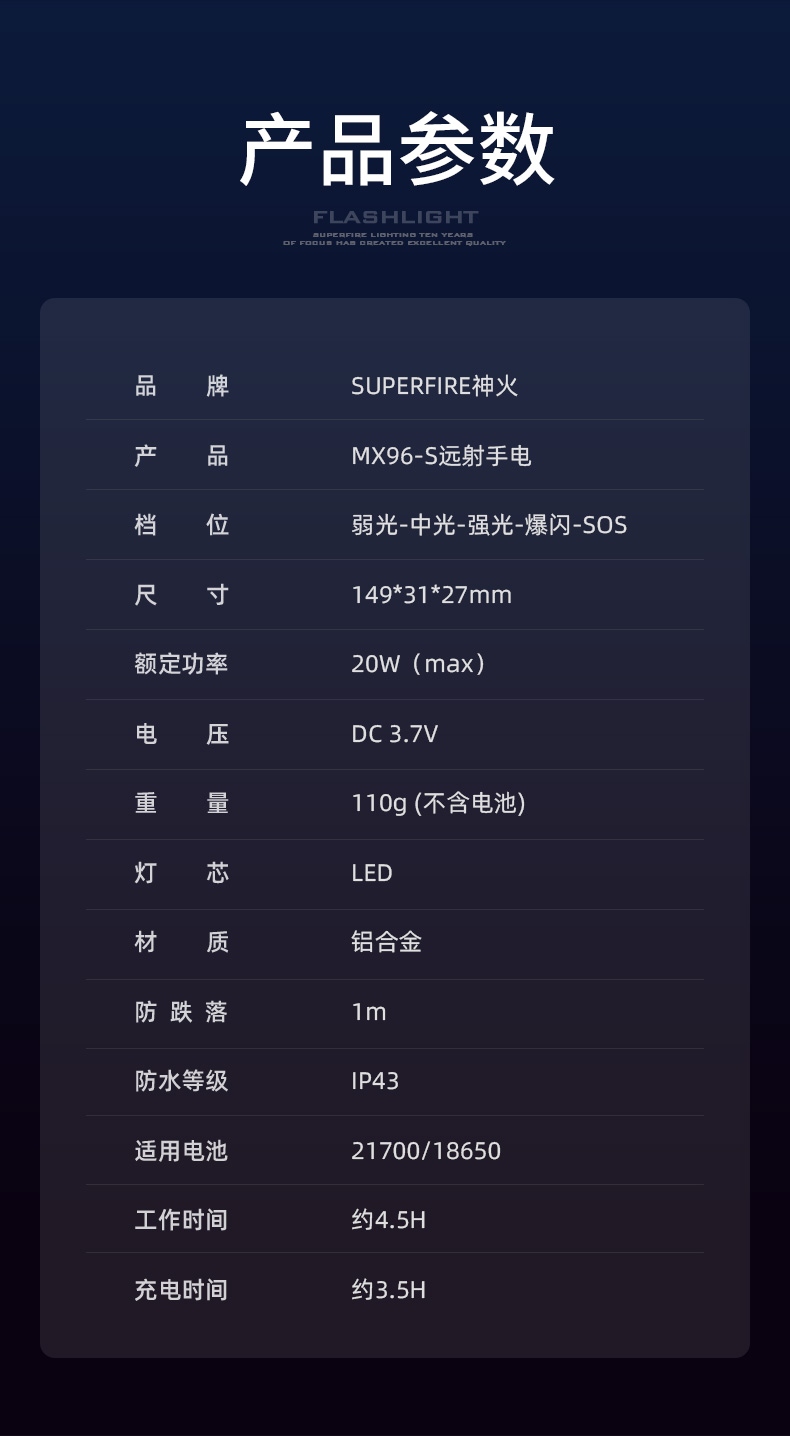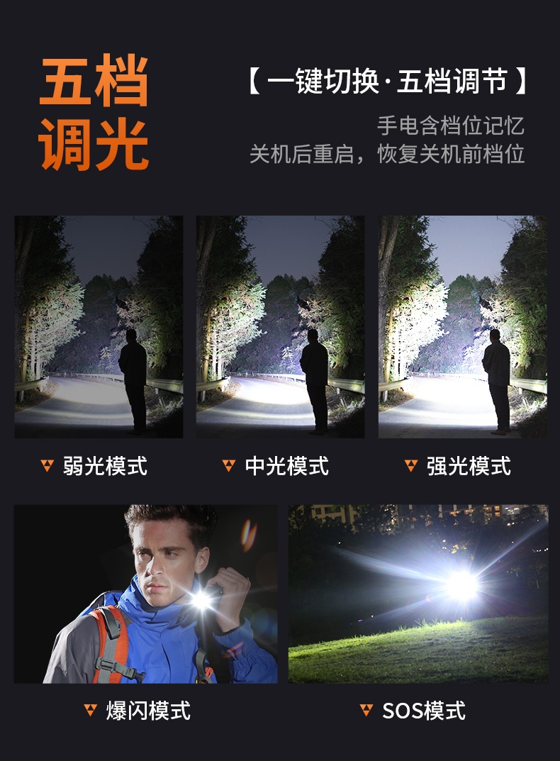 1、大功率灯芯,最高1350Lm最高亮度。 2、远射灯珠,最大650m照射距离。 3、推拉灯头,可实现伸缩调焦。