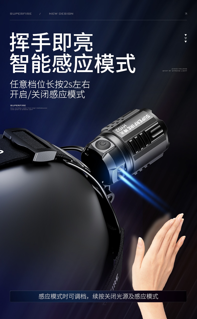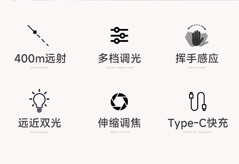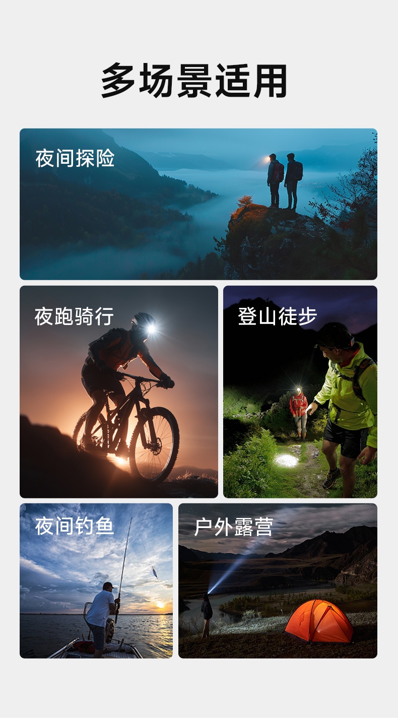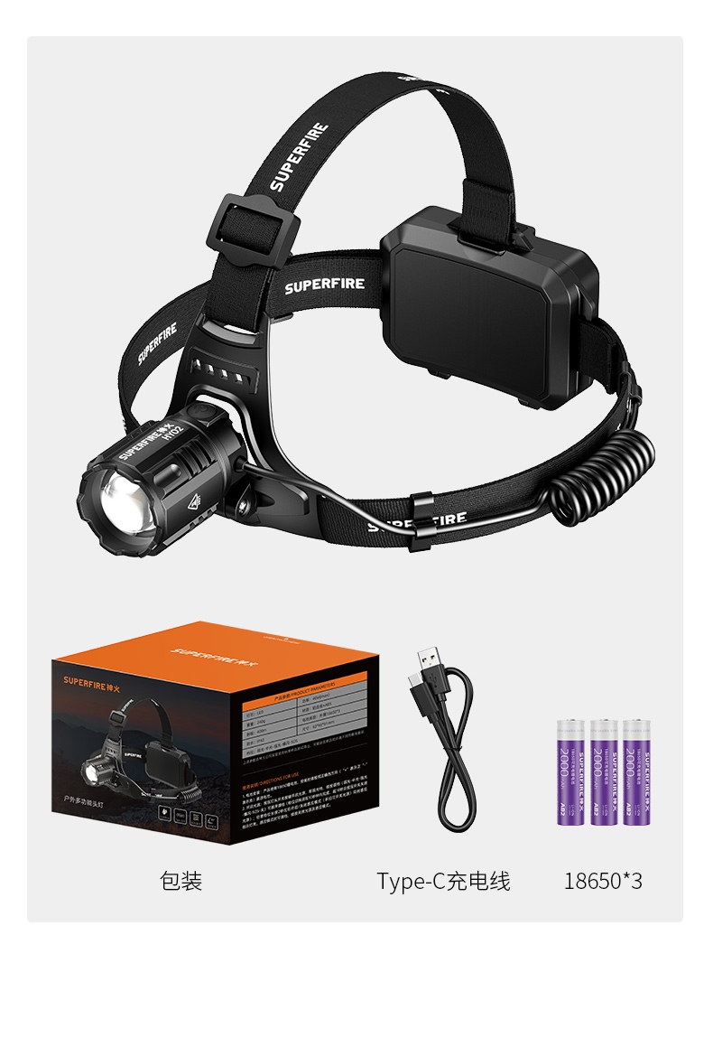 强光亮度,运动头灯,前后均衡设计,轻便不压头,可调节式头灯带,佩戴方便舒适,伸缩调焦,光照范围大,照射距离远,头灯角度调节,超90度角度随意调节,适宜各种环境使用