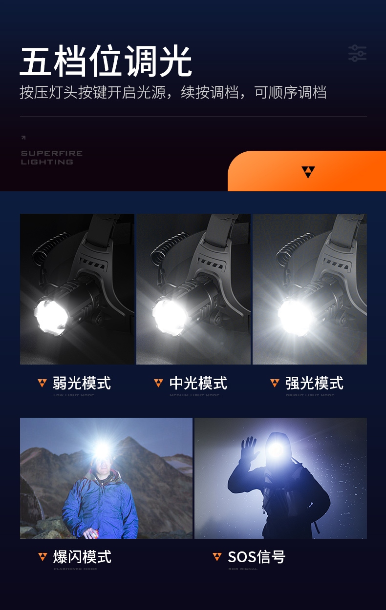 1、五档一体:弱中强、爆闪、SOS自由切换,可满足不同场景下的使用需求。