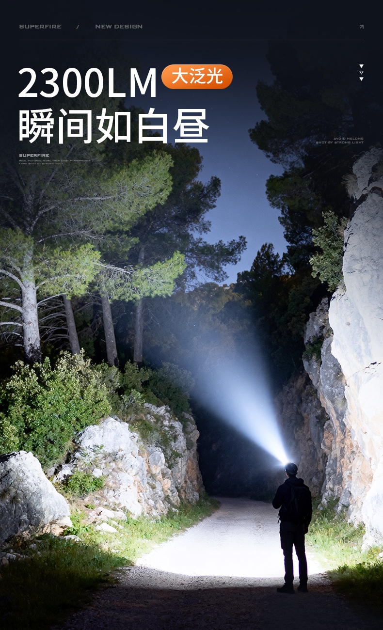 1、千米远射,射程更远,光斑更聚焦。 2、进口灯珠,亮度高,照明效果更好。 3、前后双按键,光源一键点亮,高亮瞬间开启。